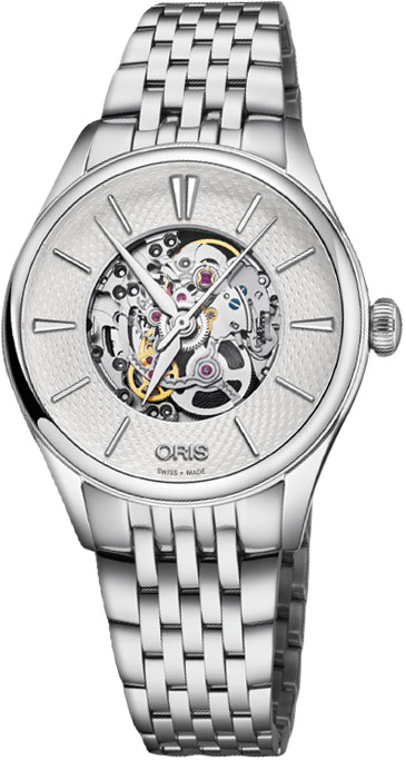 Stainless steel case with a stainless steel bracelet. Fixed stainless steel bezel. Silver (skeleton center) dial with silver-tone hands and diamond hour markers. Dial Type: Analog. Caliber 560 base ETA 2671 automatic movement with a 38-hour power reserve. Scratch resistant sapphire crystal. Pull / push crown. Transparent case back. Round case shape. Case size: 33 mm. Band width: 17 mm. Deployment clasp with a push button release. Water resistant at 50 meters / 165 feet. Functions: hour, minute, second. Artelier Series. Casual watch style. Watch label: Swiss Made. Oris Artelier Automatic Diamond Ladies Watch 01 560 7724 4051-07 8 17 79.