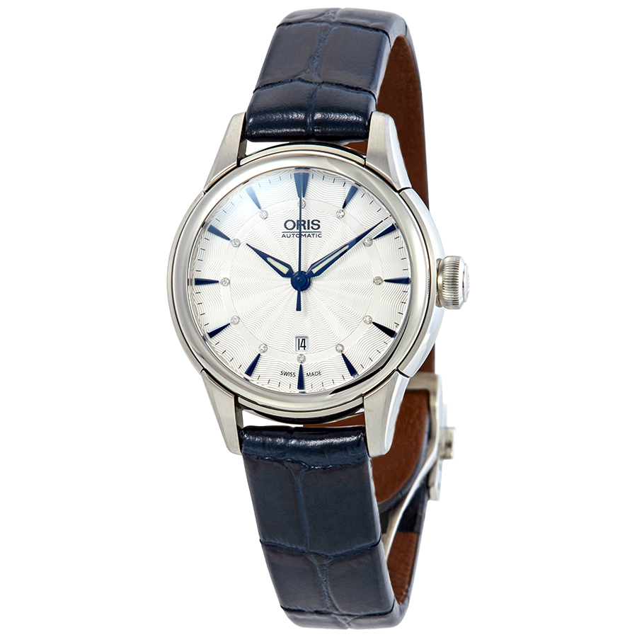 Stainless steel case with a dark blue leather strap. Fixed stainless steel bezel. Silver dial with blue hands and diamond-tipped index hour markers. Minute markers around the outer rim. Dial Type: Analog. Luminescent hands. Date display at the 6 o'clock position. Oris calibre 561, base ETA 2671 utomatic movement, based upon ETA 2671, containing 25 Jewels, bitting at 28800 vph, and has a power reserve of approximately 38 hours. Scratch resistant sapphire crystal. Push / pull crown. Transparent case back. Round case shape. Case size: 31 mm. Band width: 14 mm. Fold over clasp with a safety release. Water resistant at 50 meters / 165 feet. Functions: date, hour, minute, second. Casual watch style. Watch label: Swiss Made. Item Variations: 01 561 7687 4031-07 5 14 75FC. Oris Artelier Automatic Silver Diamond Dial Ladies Watch 561-7687-4031LS.
