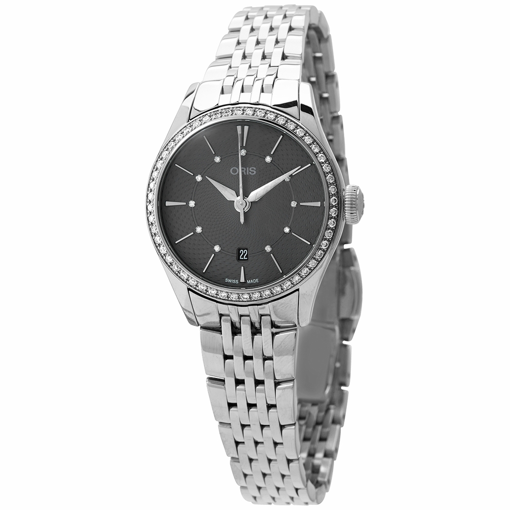 Stainless steel case with a stainless steel bracelet. Fixed stainless steel bezel set with diamonds. Grey dial with silver-tone hands and diamond-tipped index hour markers. Dial Type: Analog. Date display at the 6 o'clock position. Oris Caliber 561 automatic movement with a 38-hour power reserve. Scratch resistant sapphire crystal. Pull / push crown. Transparent case back. Round case shape. Case size: 28 mm. Band width: 14 mm. Deployment clasp with a push button release. Water resistant at 50 meters / 165 feet. Functions: date, hour, minute, second. Casual watch style. Watch label: Swiss Made. Oris Automatic Diamond Grey Dial Ladies Watch 01 561 7722 4953-07 8 14 79.