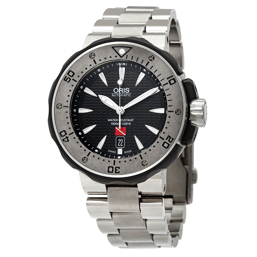 Silver-tone stainless steel case with a silver-tone stainless steel bracelet. Uni-directional rotating silver-tone stainless steel bezel. Black dial with silver-tone hands and index hour markers. Minute markers around the outer rim. Dial Type: Analog. Luminescent hands and markers. Date display at the 6 o'clock position. Oris Calibre 733 automatic movement with a 38-hour power reserve. Scratch resistant sapphire crystal. Screw down crown. Solid case back. Round case shape. Case size: 47 mm. Fold over clasp. Water resistant at 1000 meters / 3300 feet. Functions: date, hour, minute, second. Dive watch style. Watch label: Swiss Made. Item Variations: 733 7646 7184 SET, 733 7646 7184.SET, 733 7646 7184SET. Oris ProDiver Kittiwake Automatic Black Dial Mens Watch 01 733 7646 7184-SET.