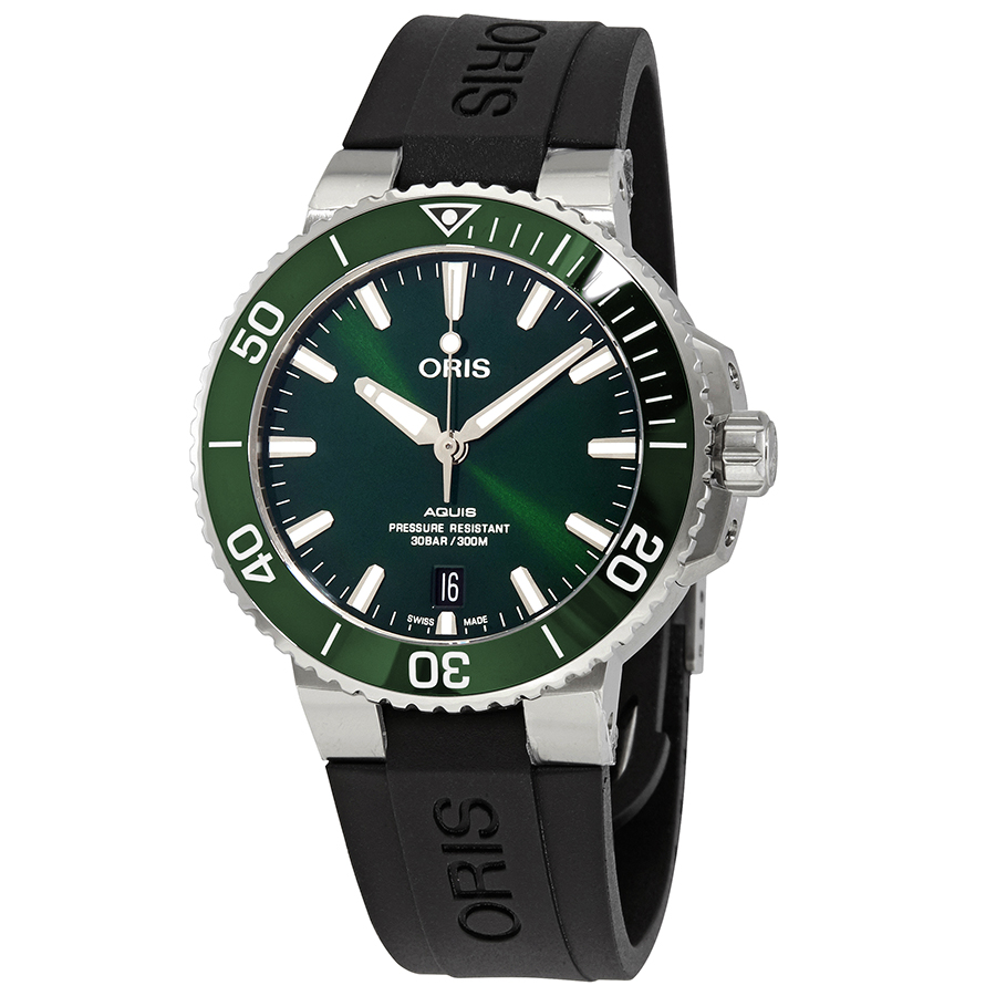 Stainless steel case with a black rubber strap. Uni-directional rotating coin edge stainless steel bezel with a green ceramic (count-up elapsed time) ring. Green dial with luminous silver-tone hands and index hour markers. Minute markers around the outer rim. Dial Type: Analog. Luminescent hands and markers. Date display at the 6 o'clock position. Oris calibre 733 automatic movement, based upon Sellita SW200-1, containing 26 Jewels, bitting at 28800 vph, and has a power reserve of approximately 38 hours. Scratch resistant sapphire crystal. Screw down crown. Transparent case back. Round case shape. Case size: 39.5 mm. Band width: 21 mm. Deployment clasp. Water resistant at 300 meters / 1000 feet. Functions: date, hour, minute, second. Aquis Date Series. Casual watch style. Watch label: Swiss Made. Oris Aquis Date Automatic Green Dial Mens Watch 01 733 7732 4157-07 4 21 64FC.