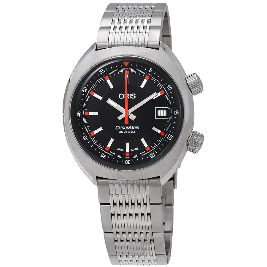 Silver-tone stainless steel case with a silver-tone stainless steel bracelet. Fixed smooth silver-tone stainless steel bezel. Black dial with luminous silver-tone hands and index hour markers. Minute markers around the outer rim. Dial Type: Analog. Luminescent hands and markers. Date display at the 3 o'clock position. Oris Calibre 733 Automatic movement, based upon Sellita SW200-1, containing 26 Jewels, bitting at 28800 vph, and has a power reserve of approximately 38 hours. Scratch resistant sapphire crystal. Screw down crown. Solid case back. Round case shape, case size: 39 mm. Band width: 19 mm. Fold over with push button release clasp. Water resistant at 100 meters / 330 feet. Functions: date, hour, minute, second. Chronoris Series. Casual watch style. Watch label: Swiss Made. Oris Chronoris Automatic Black Dial Mens Watch 01 733 7737 4054-07 8 19 01.