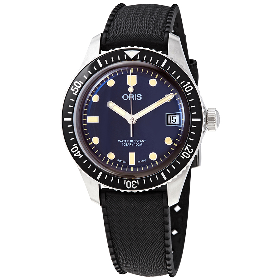 Stainless steel case with a black rubber strap. Uni-directional rotating stainless steel bezel with a black DLC ring. Blue dial with luminous silver-tone hands and dot hour markers. Minute markers around the outer rim. Dial Type: Analog. Luminescent hands and markers. Date display at the 3 o'clock position. Oris calibre 733 automatic movement, based upon Sellita SW200-1, containing 26 Jewels, bitting at 28800 vph, and has a power reserve of approximately 38 hours. Scratch resistant sapphire crystal. Screw down crown. Solid case back. Round case shape. Case size: 36 mm. Band width: 17 mm. Tang clasp. Water resistant at 100 meters / 330 feet. Functions: date, hour, minute, second. Divers Sixty Five Series. Casual watch style. Watch label: Swiss Made. Oris Divers Sixty Five Automatic Blue Dial Unisex Watch 01 733 7747 4055-07 4 17 18.