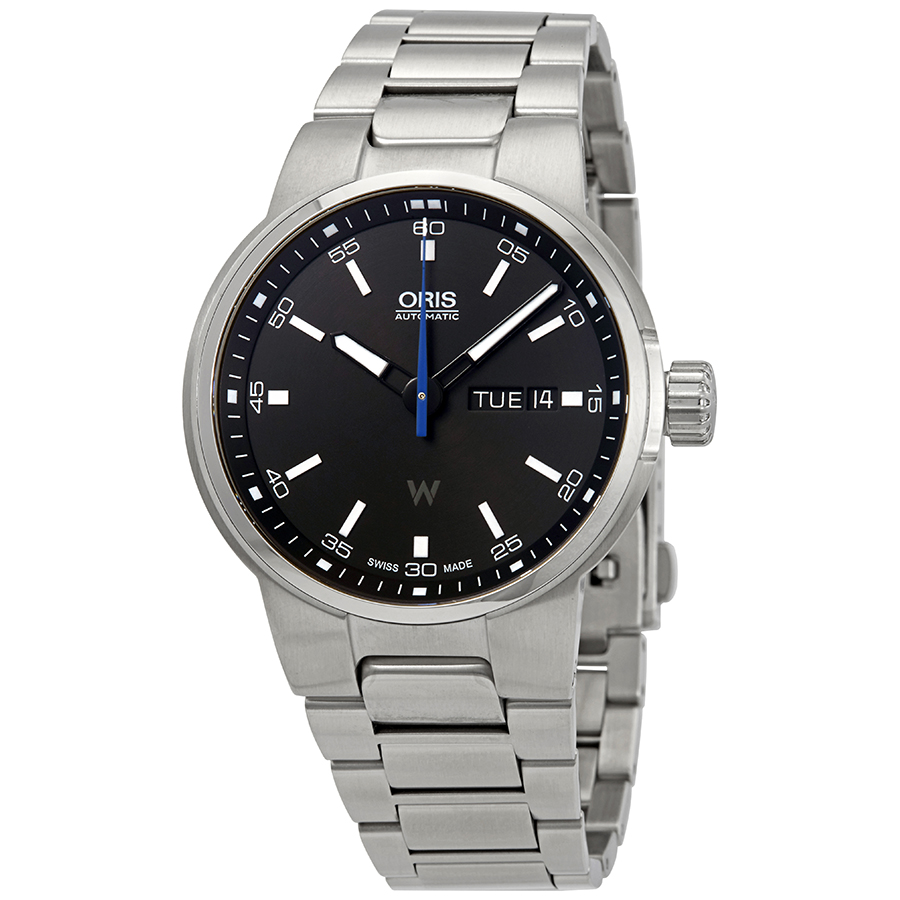 Silver-tone stainless steel case with a silver-tone stainless steel bracelet. Fixed stainless steel bezel. Black dial with black hands and index hour markers. Minute scale around the inner rim. Dial Type: Analog. Day of the week and date display at the 3 o'clock position. Oris 735 base SW 220-1 automatic movement with a 38-hour power reserve. Scratch resistant sapphire crystal. Round case shape. Case size: 42 mm. Band width: 24 mm. Water resistant at 100 meters / 330 feet. Functions: date, day, hour, minute, second. Dress watch style. Watch label: Swiss Made. Oris Williams Automatic Black Dial Mens Watch 01 735 7740 4154-07 8 24 50S.