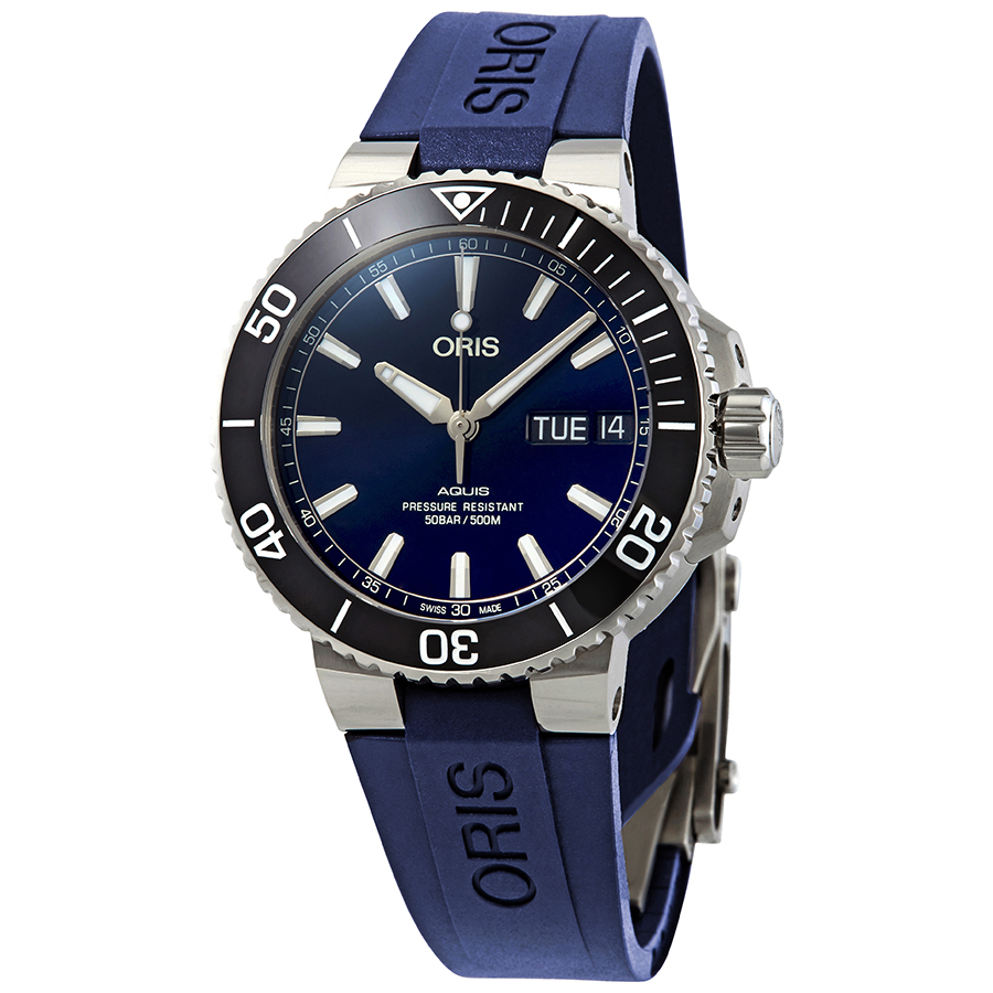 bezel Stainless steel case with a blue rubber strap. Uni-directional rotating stainless steel with a black ceramic ring. Blue dial with luminous silver-tone hands and index hour markers. Minute markers around the outer rim. Dial Type: Analog. Luminescent hands and markers. Day of the week and date display at the 3 o'clock position. Oris 752, base SW 220-1 automatic movement with a 38-hour power reserve. Scratch resistant sapphire crystal. Screw down crown. Solid case back. Round case shape. Case size: 45.5 mm. Band width: 24 mm. Fold over clasp with a push button release. Water resistant at 500 meters / 1650 feet. Functions: date, day, hour, minute, second. Dive watch style. Watch label: Swiss Made. Oris Aquis Big Day Date Automatic Blue Dial Mens Watch 01 752 7733 4135-07 4 24 65EB.