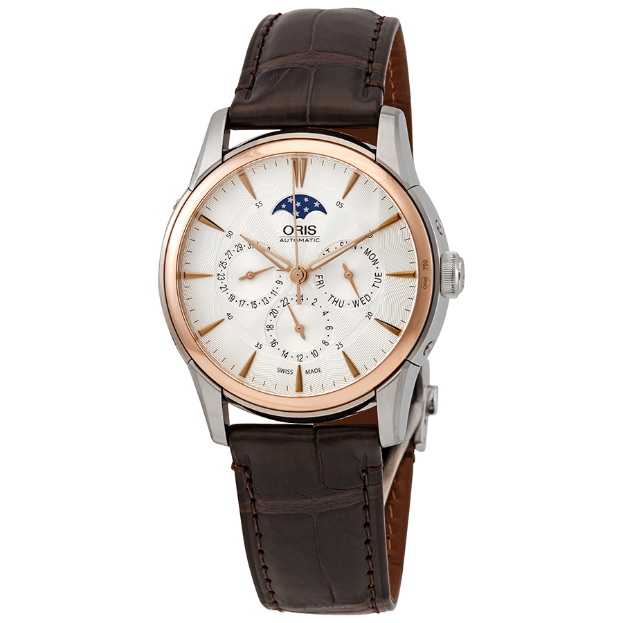 Stainless steel case with a brown (alligator) leather strap. Fixed 18kt rose gold bezel. Silver dial with luminous rose gold-tone hands and index hour markers. Minute markers around the outer rim. Dial Type: Analog. Luminescent hands. Four multi-function sub-dials displaying: day of the week, date, 24-hour and moonphase. Oris calibre 582, base ETA 2671 automatic movement with a 38-hour power reserve. Scratch resistant sapphire crystal. Screw down crown. Solid case back. Round case shape. Case size: 40 mm. Case thickness: 11.8 mm. Band width: 21 mm. Deployment with push button release clasp. Water resistant at 50 meters / 165 feet. Functions: moon phase, date, day, GMT, second time zone, hour, minute, second. Casual watch style. Watch label: Swiss Made. Item Variations: 582 7689 6351LS, 582.7689.6351LS, 58276896351LS. Oris Artelier Complication Moon Phase Silver Dial Mens Watch 582-7689-6351LS.