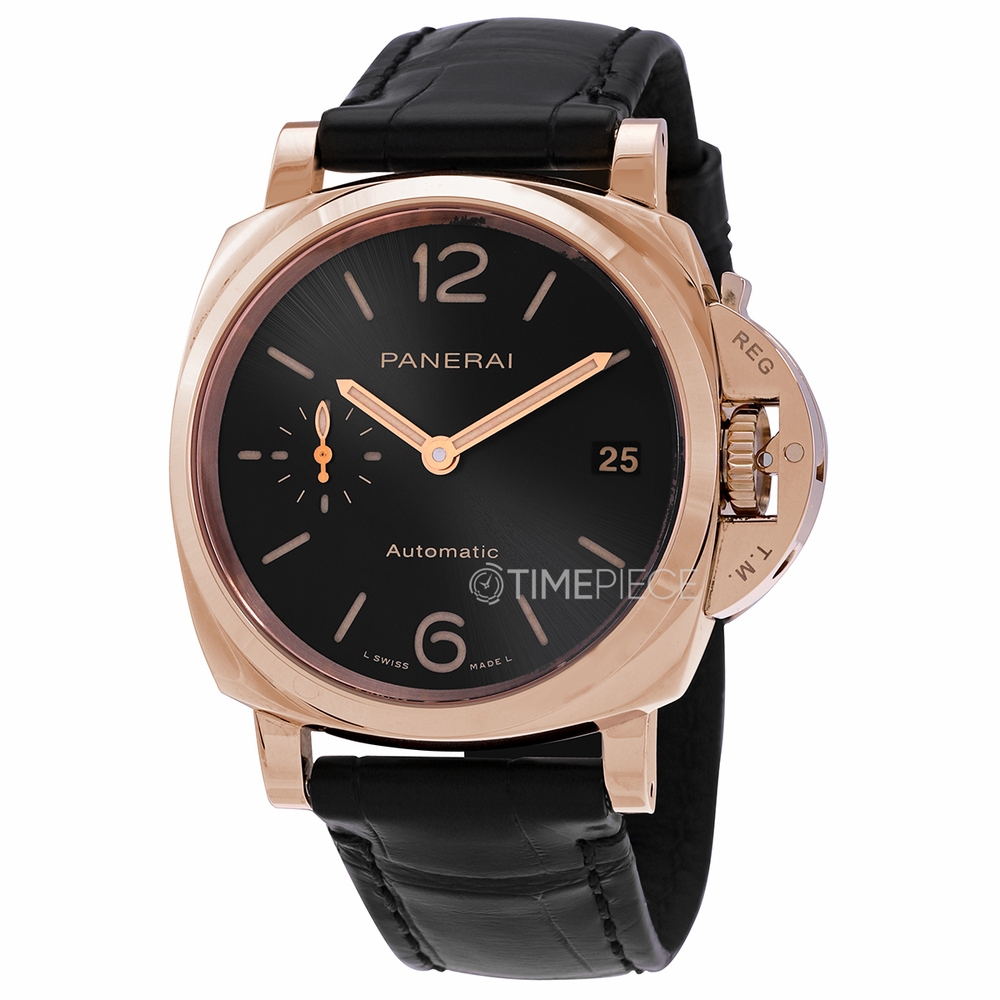 Polished goldtech case with a black (alligator) leather strap. Fixed polished goldtech bezel. Black sun-brushed dial with luminous rose gold hands and index hour markers. Arabic numerals appear at the 6 and 12 o'clock positions. Dial Type: Analog. Luminescent hands. Date display at the 3 o'clock position. One subdial displaying: small seconds. Panerai calibre P.900 automatic movement, based upon Panerai OP XXXIV, containing 25 Jewels, bitting at 28800 vph, and has a power reserve of approximately 72 hours. Scratch resistant sapphire crystal. Transparent case back. Round case shape. Case size: 38 mm. Tang clasp. Water resistant at 30 meters / 100 feet. Functions: date, hour, minute, small second. Luminor Due Series. Luxury watch style. Watch label: Swiss Made. Panerai Luminor Due Automatic Black Dial Mens Watch PAM01029.