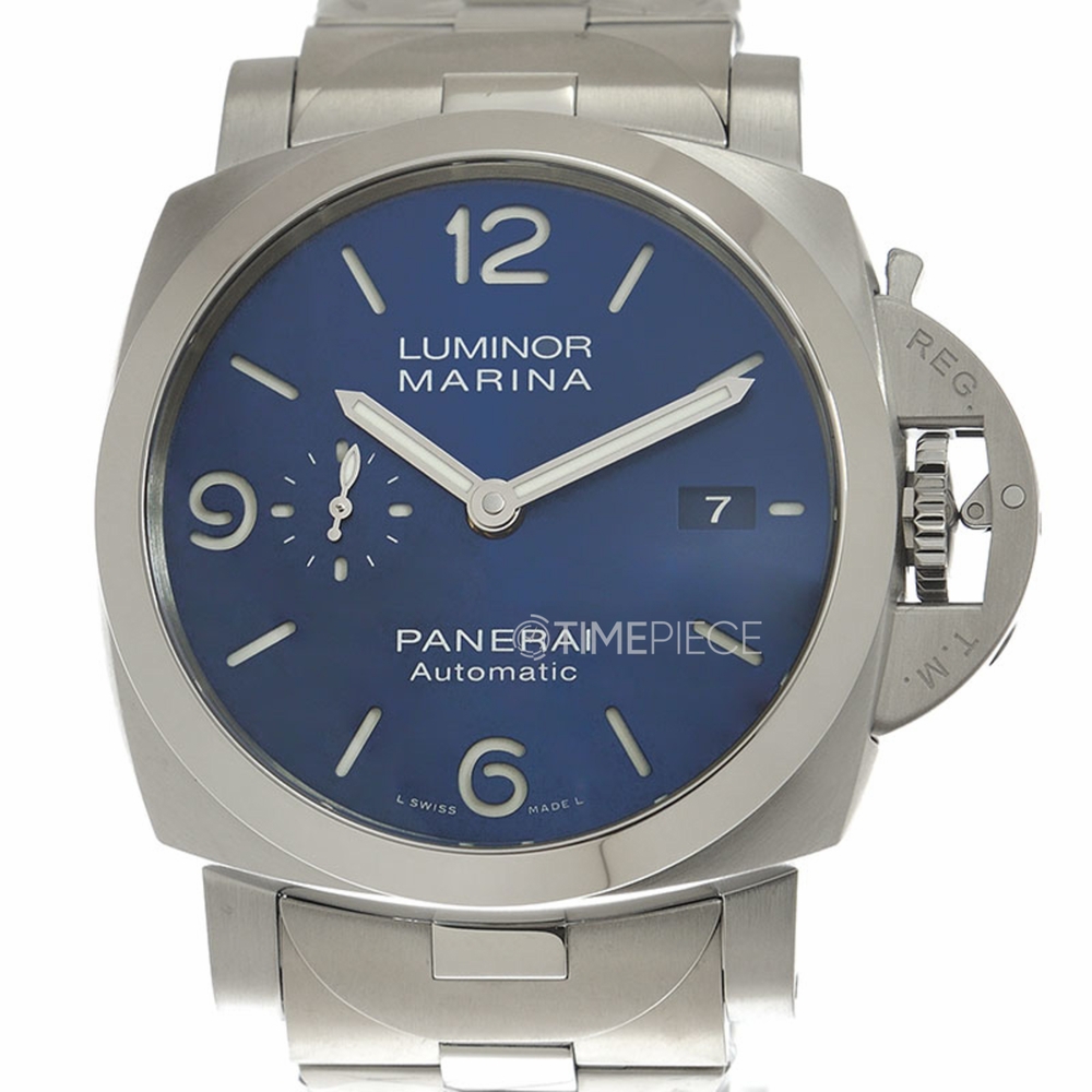 Stainless steel case with a stainless steel bracelet. Fixed stainless steel bezel. Blue sun-brushed dial with luminous silver-tone hands and index hour markers. Arabic numerals appear atthe 6, 9 and 12 o'clock positions. Dial Type: Analog. Luminescent hands. Date display at the 3 o'clock position. Small seconds sub-disal at the 9 o'clock position . Panerai calibre P.9010 automatic movement, containing 31 Jewels, composed of 200 parts, bitting at 28800 vph, and has a power reserve of approximately 72 hours. Scratch resistant sapphire crystal. Pull / push crown. Solid case back. Round case shape. Case size: 44 mm. Deployment clasp. Water resistant at 30 meters / 100 feet. Functions: date, hour, minute, small second. Luminor Marina Series. Luxury watch style. Watch label: Swiss Made. Panerai Luminor Marina Specchio Blu Automatic Mens Watch.