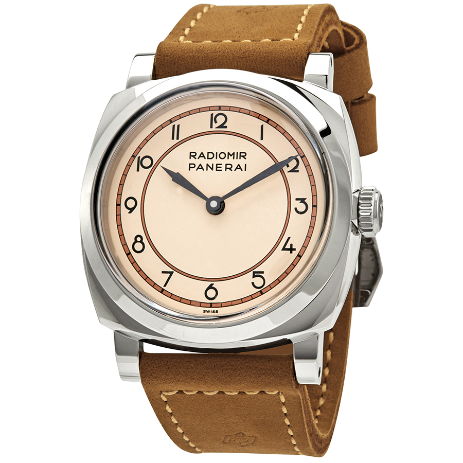 Silver-tone stainless steel case with a brown leather strap. Fixed silver-tone stainless steel bezel. Cream dial with black hands and Arabic numeral hour markers. Dial Type: Analog. Panerai Calibre P.3000 hand wind movement with a 72-hour power reserve. Scratch resistant plexi crystal. Screw down crown. Transparent case back. Cushion case shape, case size: 47 mm, case thickness: 26. Tang clasp. Water resistant at 100 meters / 330 feet. Functions: hour, minute. Sport watch style. Watch label: Swiss Made.Radiomir 1940 3 Days Art Deco Ivory