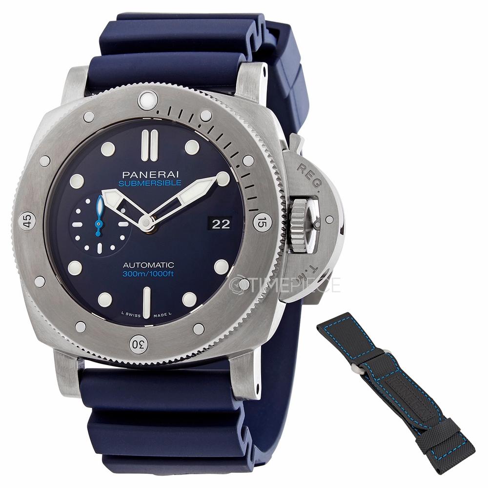 Silver-tone bmg-tech case with a blue rubber strap. Uni-directional rotating silver-tone bmg-tech (count-up elapsed time top) ring bezel. Blue dial with luminous silver-tone skeleton sword-shaped hands and dot hour markers. Dial Type: Analog. Luminescent hands and markers. Date display at the 3 o'clock position. One subdial displaying: small second. Panerai Calibre P.9010 Automatic movement, containing 31 Jewels, composed of 200 parts, bitting at 28800 vph, and has a power reserve of approximately 72 hours. Scratch resistant sapphire crystal. Screw down crown. Solid case back. Cushion case shape, case size: 47 mm, case thickness: 15 mm. Band width: 26/22.0 standard mm, band length: 8 inches. Tang clasp. Water resistant at 300 meters / 1000 feet. Functions: date, hour, minute, second. Additional Info: comes with box & papers and 2 brand new extra straps. Submersible Bmg-tech Series. Dive watch style. Watch label: Swiss Made. Panerai Submersible BMG-TECH Automatic Blue Dial Mens Watch PAM00692.