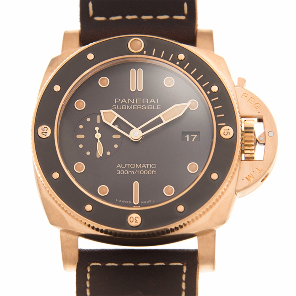 Gold-tone bronze and titanium case with a brown leather strap. Anti-clockwise rotating coin edge ceramic bezel with a black count-up elapsed time top ring. Brown dial with gold-tone skeleton sword-shaped hands and index hour markers. Dial Type: Analog. Luminescent hands and markers. Date display at the 3 o'clock position. One subdial displaying: small second. Panerai Calibre P.9010 Automatic movement, containing 31 Jewels, composed of 200 parts, bitting at 28800 vph, and has a power reserve of approximately 72 hours. Scratch resistant sapphire crystal. Screw down crown. Transparent case back. Cushion case shape, case size: 47 mm. Tang clasp. Water resistant at 300 meters / 1000 feet. Functions: date, hour, minute, second. Luminor 1950 Series. Dive watch style. Watch label: Swiss Made. Panerai Luminor 1950 Automatic Brown Dial Mens Watch PAM00968.