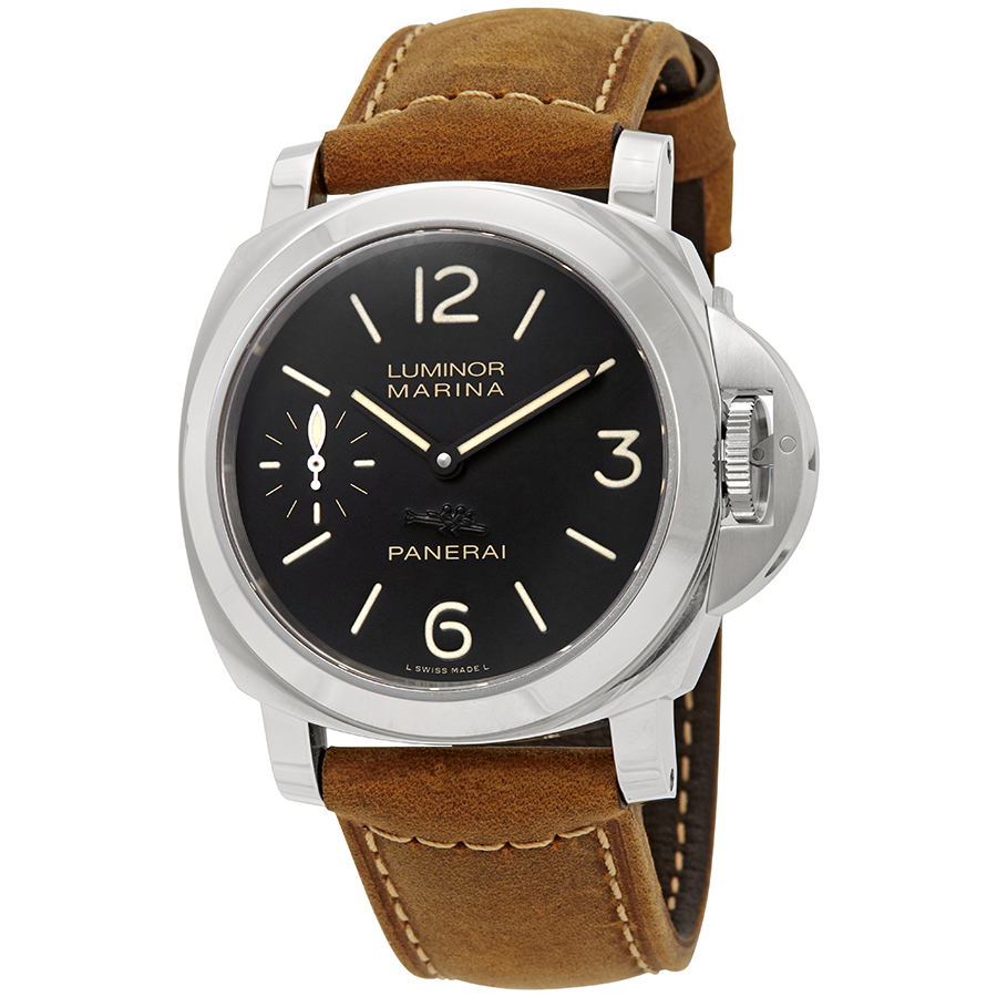 Silver-tone stainless steel case with a brown leather strap. Fixed silver-tone stainless steel bezel. Black dial with silver-tone hands and index-Arabic numeals hour markers. Dial Type: Analog. Luminescent hands and markers. One- small seconds subdials. Panerai Calibre OP II Hand Wind movement, based upon ETA 6497-1, containing 17 Jewels, bitting at 21600 vph, and has a power reserve of approximately 56 hours. Scratch resistant sapphire crystal. Screw down crown. Solid case back. Cushion case shape. Case size: 44 mm. Band width: 24/22 mm. Buckle clasp. Water resistant at 300 meters / 1000 feet. Functions: hour, minute, second. Additional Info: limited edition of 80 units. Dive watch style. Watch label: Swiss Made. Panerai Luminor Marina Black Dial Mens Hand Wound Watch PAM00541.