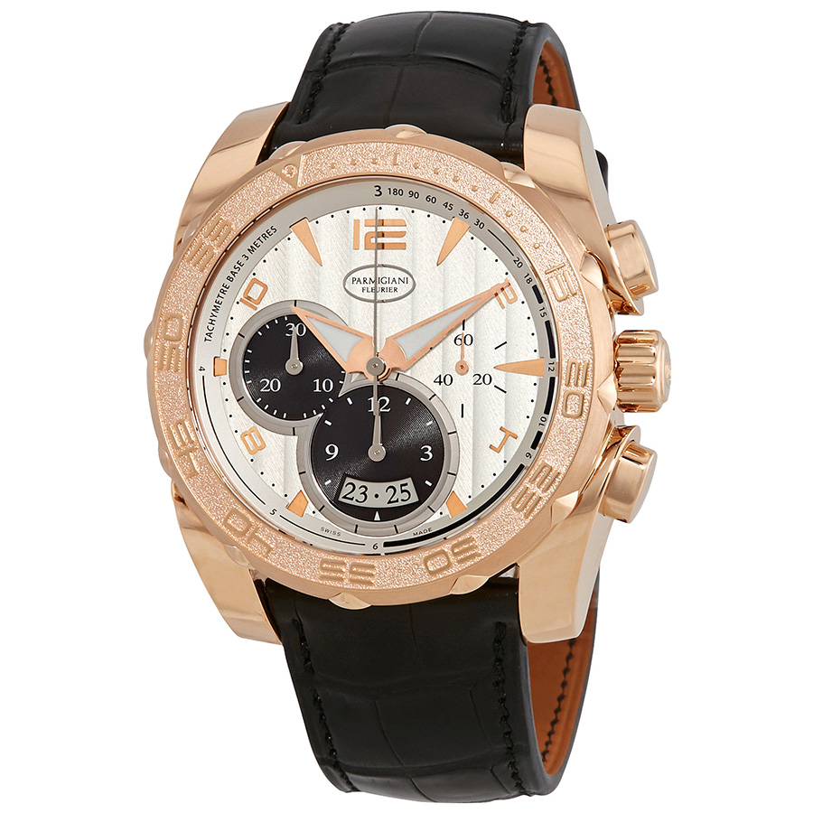 18kt rose gold case with a black alligator leather strap. Uni-directional rotating 18kt rose gold bezel. Silver-tone dial with gold-tone hands and Arabic numeral and index hour markers. Tachymeter scale around the outer rim. Dial Type: Analog. Luminescent hands. Date display at the 6 o'clock position. Chronograph - three sub-dials displaying: 60 second, 30 minute and 12 hour. Parmigiani Fleurier Calibre PF334 automatic movement with a 50-hour power reserve. Scratch resistant sapphire crystal. Solid case back. Round case shape, case size: 45 mm, case thickness: 14.2 mm. Fold over clasp. Water resistant at 200 meters / 660 feet. Functions: chronograph, date, hour, minute, second. Luxury watch style. Watch label: Swiss Made. Parmigiani Fleurier Pershing 005 Chronograph Automatic 18kt Rose Gold Silver Dial Mens Watch PFC528-1010101-HA1442.