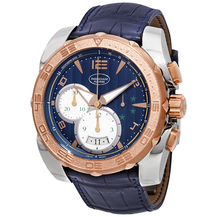 Grey titanium case with a (alligator) leather strap. Rotating 18kt rose gold bezel. Blue dial with luminous rose gold-tone hands and alternating Arabic numeral and index hour markers. Minute markers. tachymeter markings around the outer rim. Dial Type: Analog. Luminescent hands. Date display at the 6 o'clock position. Chronograph - three sub-dials displaying: 60 second, 30 minute and 12 hour. Parmigiani Fleurier Calibre PF334 automatic movement with a 50-hour power reserve. Scratch resistant sapphire crystal. Solid case back. Round case shape, case size: 45 mm, case thickness: 14.20 mm. Deployment clasp. Water resistant at 100 meters / 330 feet. Functions: date, hour, minute, second. Luxury watch style. Watch label: Swiss Made. Parmigiani Fleurier Pershing 005 Chronograph Automatic Blue Dial Mens Watch PFC528-3102500-XA3142.