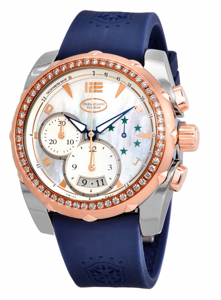 Silver-tone stainless steel case with a blue rubber strap. Fixed 18kt rose gold diamond set bezel. Mother of pearl dial with blue alpha-style shape hands and alternating Arabic numeral and index hour markers. Minute markers. tachymeter markings around the outer rim. Dial Type: Analog. Luminescent hands and markers. Date display at the 6 o'clock position. Chronograph - three sub-dials displaying: 60 second, 30 minute and 12 hour. Parmigiani Fleurier Calibre PF334 Automatic movement, containing 68 Jewels, composed of 303 parts, bitting at 28800 vph, and has a power reserve of approximately 50 hours. Scratch resistant sapphire crystal. Pull / push crown. Solid case back. Round case shape, case size: 42 mm, case thickness: 13.1 mm. Deployment clasp. Water resistant at 30 meters / 100 feet. Functions: chronograph, tachymeter, date, hour, minute, second. Luxury watch style. Watch label: Swiss Made. Parmigiani Fleurier Pershing Chronograph Automatic Ladies Blue Rubber Watch PFC528-3163300-XA2422.