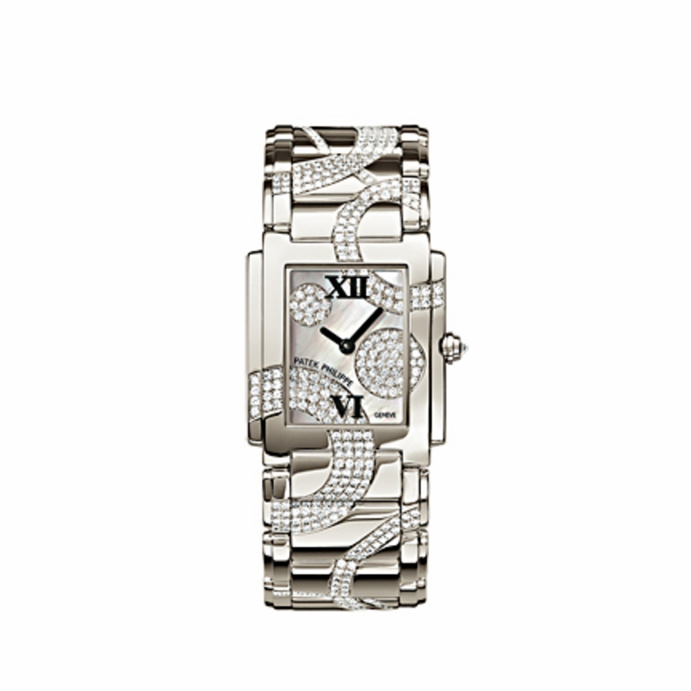 18k white gold case with a 18k white gold bracelet. Fixed bezel. Mother of pearl set with diamonds dial with black hands and Roman numerals hour markers. Dial Type: Analog. Quartz movement. Patek philippe e15 engine. Scratch resistant sapphire crystal. Pull / push crown. Solid case back. Case diameter: 25mm x 30 mm. Case thickness: 6 mm. Rectangle case shape. Band length: 7 inches. Deployment with push button clasp. Water resistant at 30 meters / 100 feet. Functions: hour, minute. Additional Info: case, dial and bracelet set with diamonds, crown set with one diamond (~0.05 ct.). Luxury watch style. Watch label: Swiss Made. Item Variations: 4910 49G, 4910-49g, 4910-49G 001, 4910 49G-001. Patek Philippe Twenty-4 Mother of Pearl set with Diamonds Dial Ladies Watch 4910-49G.