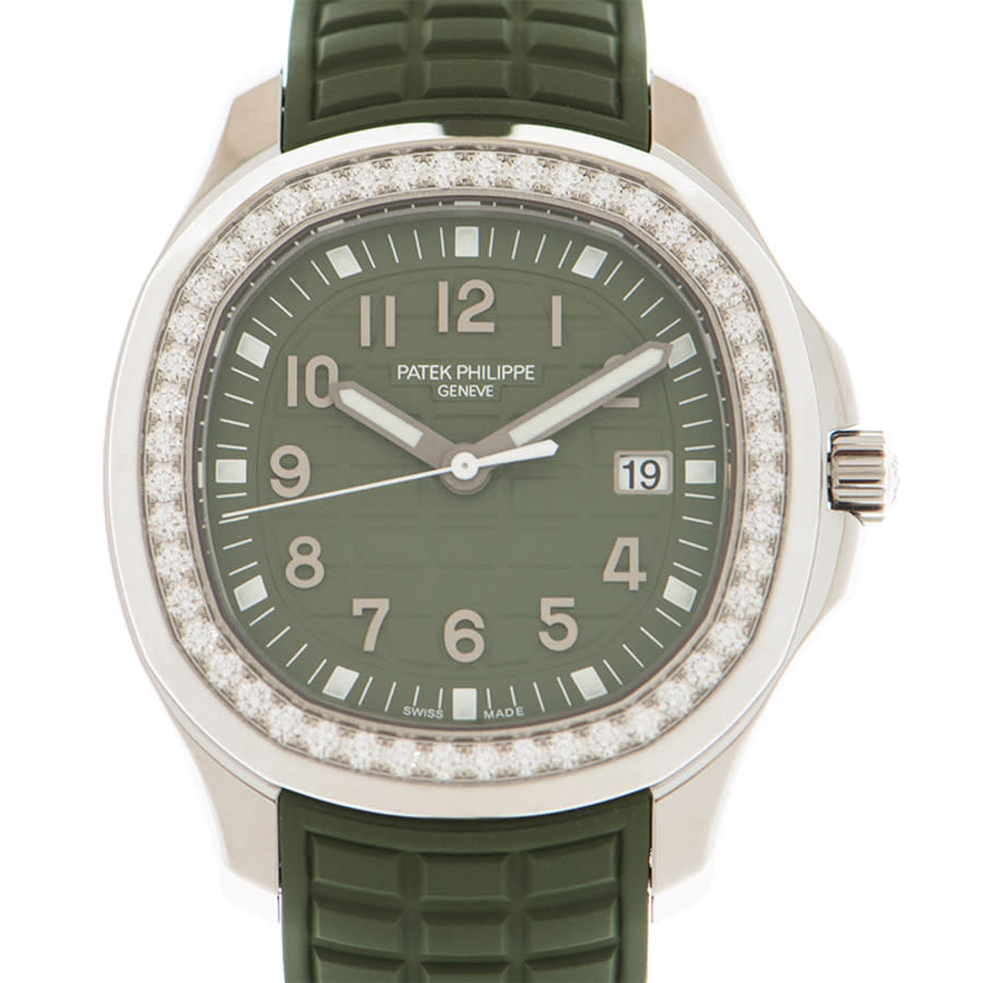Silver-tone stainless steel case with a green rubber strap. Fixed silver-tone bezel with diamond set stainless steel. Green dial with silver-tone hands and Arabic numeral hour markers. Minute markers around the outer rim. Dial Type: Analog. Luminescent hands and markers. Date display at the 3 o'clock position. Patek Philippe Calibre E23-250 S C quartz movement. Scratch resistant sapphire crystal. Screw down crown. Solid case back. Round case shape, case size: 38.8 mm, case thickness: 7.9 mm. Deployment clasp. Water resistant at 120 meters / 400 feet. Functions: date, hour, minute, second. Additional Info: original box, international warranty card, manual (complete accessories). Aquanaut Series. Luxury watch style. Watch label: Swiss Made. Patek Philippe Aquanaut Luce Quartz Diamond Green Dial Ladies Watch 5267-200A-011.