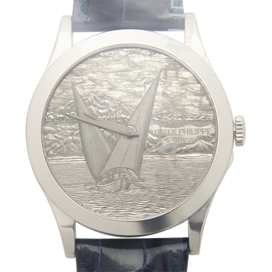 18kt white gold case with a blue alligator band. Fixed 18kt white gold bezel. Silver-tone dial with white dauphine-style shape hands. Dial Type: Analog. Patek Philippe Calibre 240 Automatic movement, containing 27 Jewels, composed of 161 parts, bitting at 21600 vph, and has a power reserve of approximately 48 hours. Scratch resistant sapphire crystal. Screw down crown. Solid case back. Round case shape. Case size: 38.60 mm. Tang clasp. Functions: hour, minute. Additional Info: limited to 40 units. Luxury watch style. Watch label: Swiss Made. Patek Philippe Calatrava "Breeze and Storm" Automatic Silver Dial Mens Watch 5089G-015.
