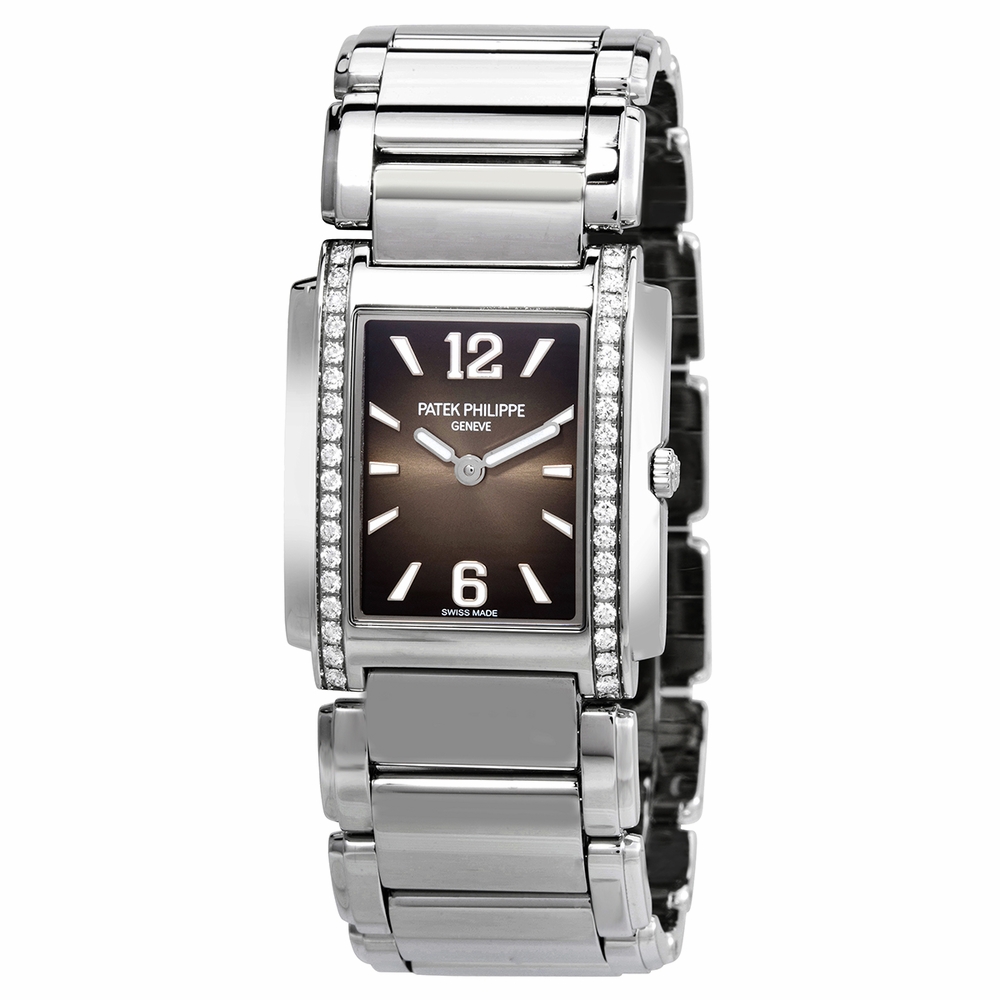 Stainless steel case with a stainless steel bracelet. Fixed stainless steel bezel set with diamonds. Grey sunburst dial with luminous silver-tone hands and index hour markers. Arabic numerals appear at the 6 and 12 o'clock positions. Dial Type: Analog. Luminescent hands and markers. Patek Philippe calibre E15 quartz movement. Scratch resistant sapphire crystal. Solid case back. Rectangle case shape. Case dimensions: 25.1 mm x 30 mm. Case thickness: 6.8 mm. Fold over clasp. Water resistant at 30 meters / 100 feet. Functions: hour, minute. Twenty-4 Series. Luxury watch style. Watch label: Swiss Made. Patek Philippe Twenty-4 Quartz Grey Sunburst Diamond Ladies Watch 4910-1200A-010.
