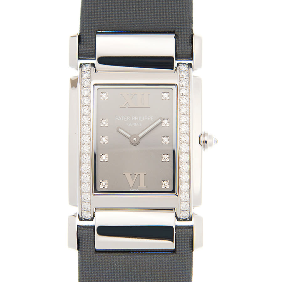 18 carat white gold case with a grey satin bracelet. Fixed bezel. Eternal gray dial with silver-tone hands and diamonds- Roman numerals at the 6 and 12 o' clock hour markers. Dial Type: Analog. Luminescent hands. Quartz movement. Caliber e15 engine. Scratch resistant sapphire crystal. Solid case back. Case diameter: 25 x 30 mm. Rectangle case shape. Tang clasp. Water resistant at 30 meters / 100 feet. Functions: hour, minute. Additional Info: case set with 34 diamonds (~0.66 ct.), crown set with one diamond (~0.05 ct.), 6 jewels. Luxury watch style. Watch label: Swiss Made. Item Variations: 4920G 001, 4920G.001, 4920G001. Patek Philippe Twenty~4 Medium Eternal Gray Dial 18 Carat White Gold Ladies Watch 4920G-001.