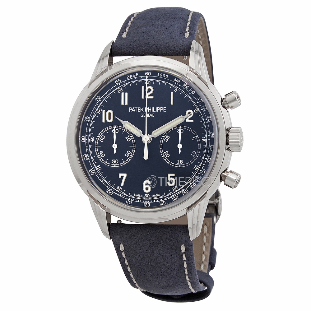 18kt white gold case with a navy blue calfskin band. Fixed 18kt white gold bezel. Blue varnished dial with silver-tone hands and Arabic numeral hour markers. Tachymeter. Dial Type: Analog. Luminescent hands and markers. Chronograph - two sub-dials displaying: 60 second and 30 minute. Patek Philippe Calibre CH 29-535 PS Hand Wind movement, containing 33 Jewels, composed of 269 parts, bitting at 28800 vph, and has a power reserve of approximately 65 hours. Scratch resistant sapphire crystal. Transparent case back. Round case shape, case size: 41 mm, case thickness: 11.45 mm. Fold-over clasp. Water resistant at 30 meters / 100 feet. Functions: chronograph, hour, minute, second. Complications Series. Luxury watch style. Watch label: Swiss Made. Patek Philippe Complications Chronograph Hand Wind Mens Watch 5172G-001.