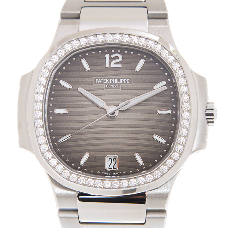 Stainless steel case with a stainless steel bracelet. Fixed stainless steel bezel set with 56 diamonds (~0.67 ct). Grey opaline dial with luminous silver-tone hands and gold index hour markers. Arabic numeral appears at the 12 o'clock position. Minute markers around the outer rim. Dial Type: Analog. Luminescent hands and markers. Date display at the 6 o'clock position. Patek Philippe calibre 324 S C automatic movement, containing 29 Jewels, composed of 213 parts, bitting at 28800 vph, and has a power reserve of approximately 45 hours. Scratch resistant sapphire crystal. Transparent sapphire case back. Oval case shape. Case size: 35.2 mm. Case thickness: 8.62 mm. Nautilus fold over clasp. Water resistant at 60 meters / 200 feet. Functions: date, hour, minute, second. Nautilus Series. Luxury watch style. Watch label: Swiss Made. Patek Philippe Nautilus Automatic Grey Dial Ladies Watch 7118-1200A-011.