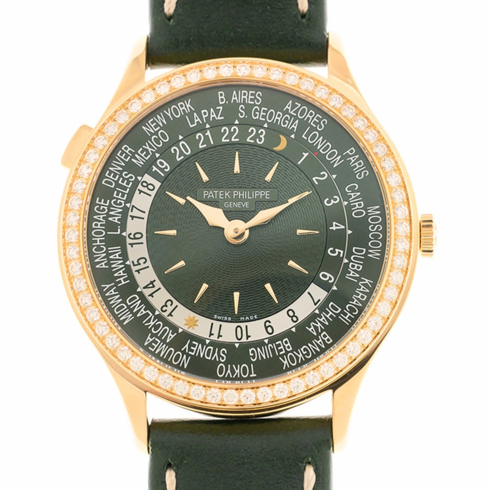 Rose gold-tone 18kt rose gold case with a green leather strap. 18kt rose gold rose gold-tone bezel with crystal set. Olive green dial with gold-tone hands and index hour markers. Dial Type: Analog. One subdial displaying: moonphase. Patek Philippe Calibre 240 HU LU Automatic movement, based upon 240 HU, containing 35 Jewels, composed of 270 parts, bitting at 21600 vph, and has a power reserve of approximately 48 hours. Scratch resistant sapphire crystal. Round case shape, case size: 36 mm, case thickness: 8.83 mm. Buckle clasp. Water resistant at 30 meters / 100 feet. Functions: moon phase, world time, GMT, hour, minute, day/night indicator. Additional Info: bezel set with 62 diamonds (~0.82 ct). prong buckle set with 27 diamonds (~0.21 ct.). Dress watch style. Watch label: Swiss Made. Patek Philippe World Time Automatic Crystal Mens Watch 7130R-014.