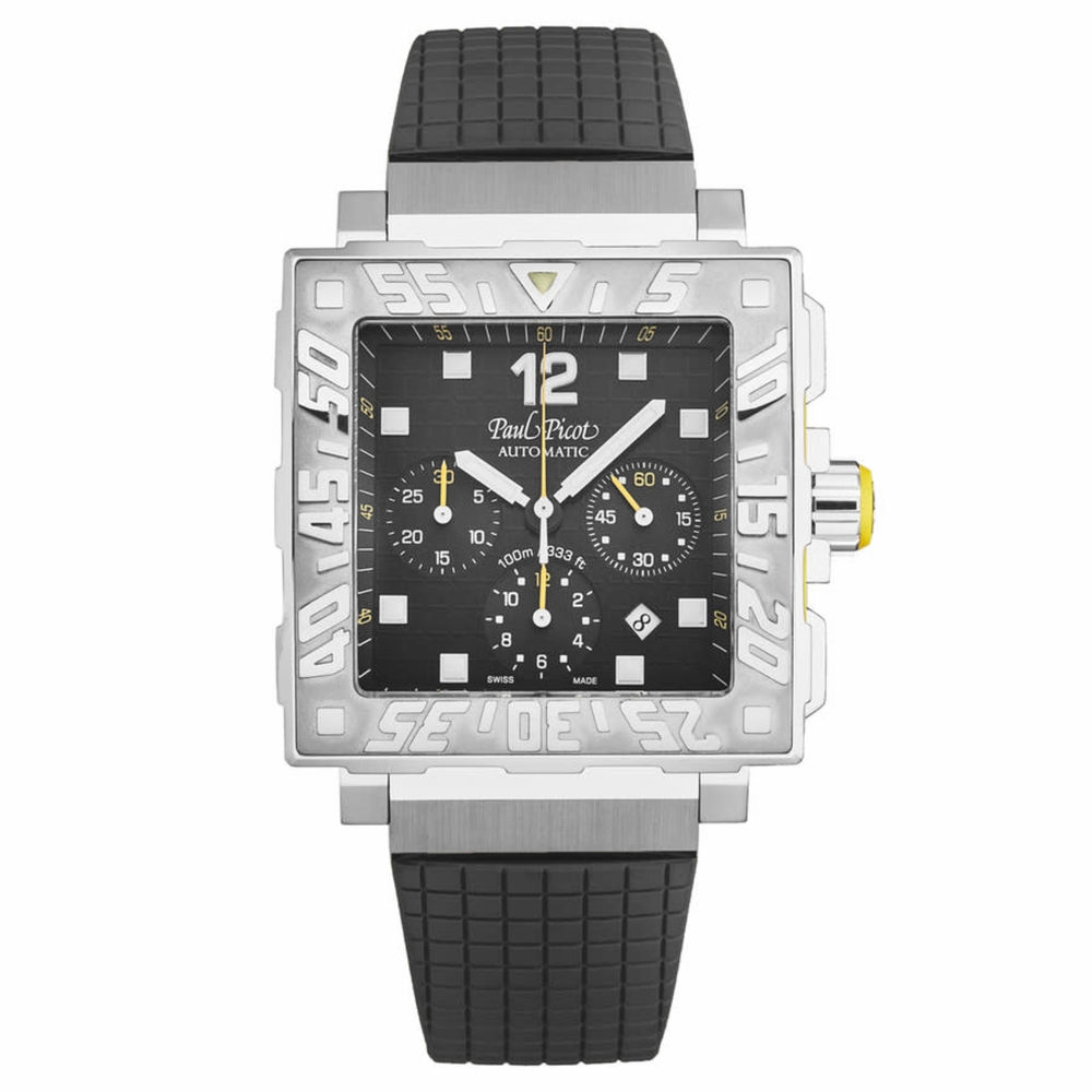 Silver-tone stainless steel case with a black rubber strap. Fixed silver-tone stainless steel bezel. Black dial with silver-tone hands and index hour markers. Minute markers around the outer rim. Dial Type: Analog. Luminescent hands and markers. Date display between 4 and 5 o'clock position. ETA Caliber 2892 Automatic movement, containing 21 Jewels, bitting at 28800 vph, and has a power reserve of approximately 42 hours. Scratch resistant sapphire crystal. Screw down crown. Solid case back. Square case shape, case size: 42 mm, case thickness: 14 mm. Band width: 25 mm, band length: 8 inches. Deployment with push button release clasp. Water resistant at 100 meters / 330 feet. Functions: date, hour, minute, second. Additional Info: hours, minutes, small seconds, chronograph, date. C-type Series. Luxury watch style. Watch label: Swiss Movt. Paul Picot C-Type Automatic Black Dial Mens Watch P0830.SG.5010.3301.