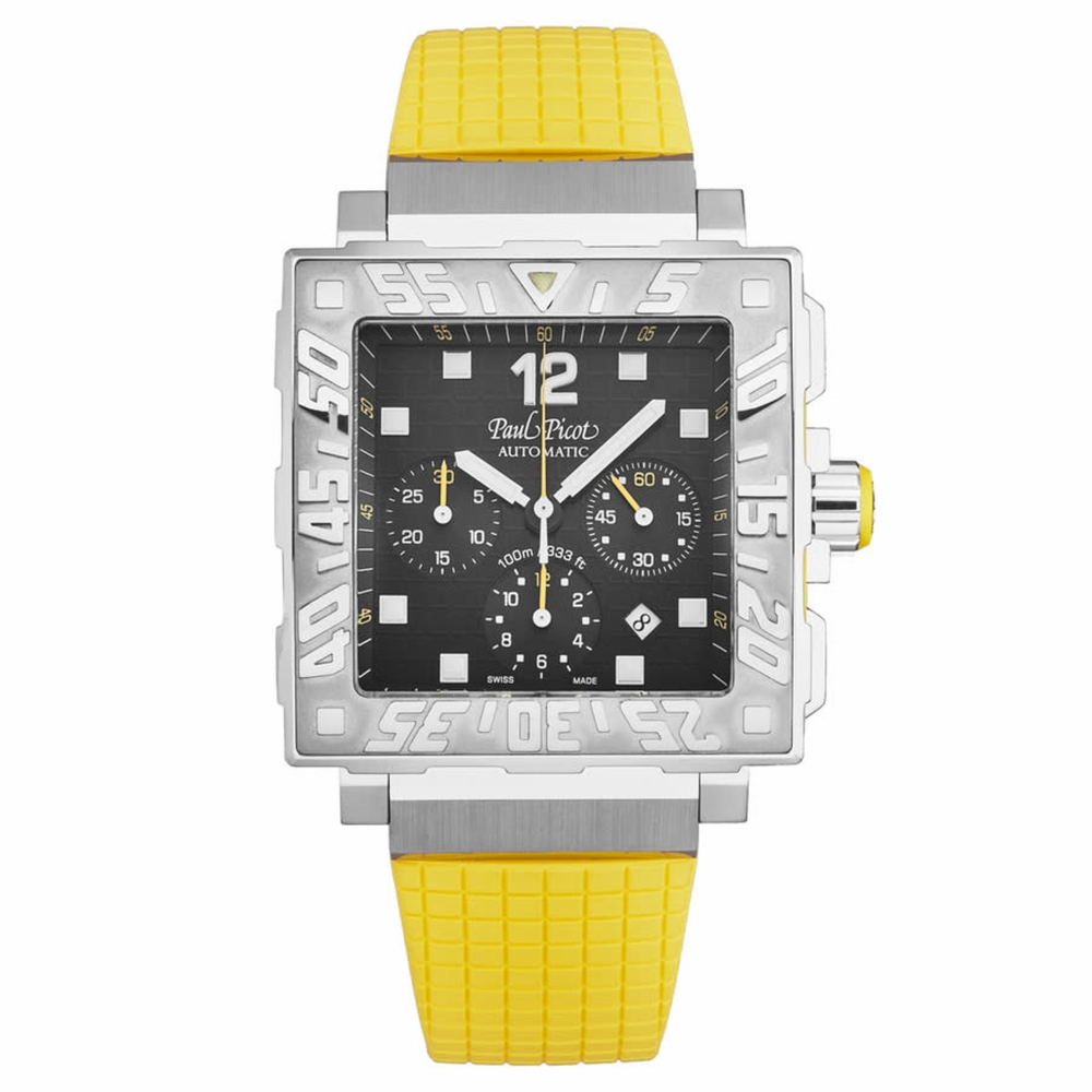Silver-tone stainless steel case with a yellow rubber strap. Fixed silver-tone stainless steel bezel. Black dial with silver-tone hands and index hour markers. Minute markers around the outer rim. Dial Type: Analog. Luminescent hands and markers. Date display between 4 and 5 o'clock position. ETA Caliber 2892 Automatic movement, containing 21 Jewels, bitting at 28800 vph, and has a power reserve of approximately 42 hours. Scratch resistant sapphire crystal. Screw down crown. Solid case back. Square case shape, case size: 42 mm, case thickness: 14 mm. Band width: 25 mm, band length: 8 inches. Deployment with push button release clasp. Water resistant at 100 meters / 330 feet. Functions: date, hour, minute, second. Additional Info: hours, minutes, small seconds, chronograph, date. C-type Series. Luxury watch style. Watch label: Swiss Movt. Paul Picot C-Type Automatic Black Dial Mens Watch P0830.SG.5601.3301.