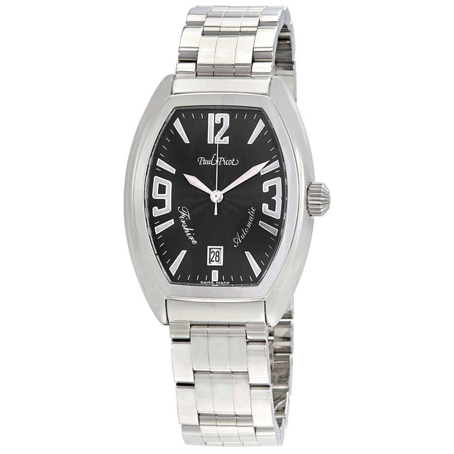 Silver-tone stainless steel case with a silver-tone stainless steel bracelet. Fixed silver-tone bezel. Black dial with silver-tone hands and Arabic numeral and index hour markers. Dial Type: Analog. Date display at the 6 o'clock position. Automatic movement. Scratch resistant sapphire crystal. Solid case back. Tonneau case shape, case size: 35 mm x 37 mm, case thickness: 10 mm. Band width: 18 mm. Water resistant at 30 meters / 100 feet. Functions: date, hour, minute, second. Casual watch style. Watch label: Swiss Made. Paul Picot Firshire 2000 Automatic Black Dial Ladies Watch P4097.20.393.