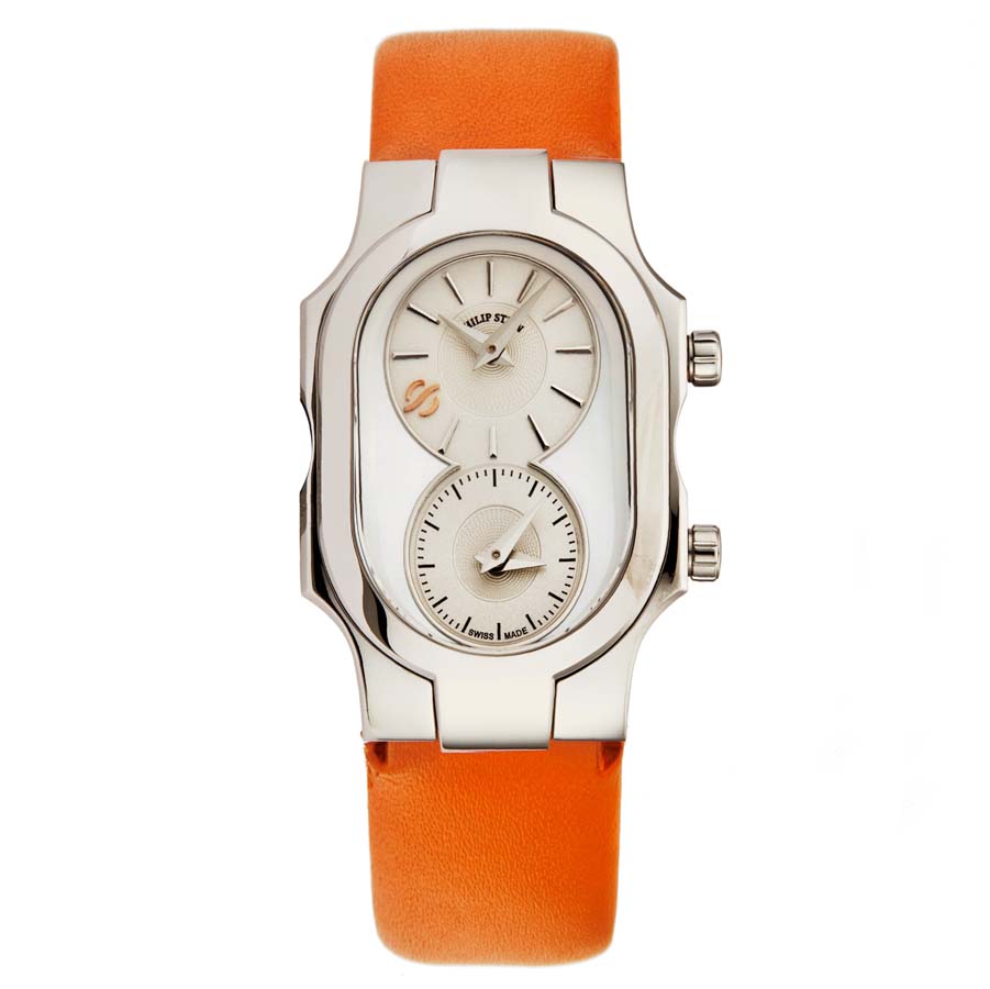 Stainless steel case with a orange leather strap. Fixed stainless steel bezel. Mother of pearl (dual time) dial with silver hands and index hour markers. Minute markers around the outer rim. Dial Type: Analog. Quartz movement. Scratch-resistant sapphire crystal crystal. Push/pull crown. Solid case back. Oval case shape. Case dimensions: 42 mm x 27 mm. Case thickness: 9 mm. Band width: 18 mm. Band length: 7 inches. Tang clasp. Water resistant at 30 meters / 100 feet. Functions: hour, minute, second, second time zone. Casual watch style. Watch label: Swiss Made. Philip Stein Signature Quartz Watch 100SMOPKO.