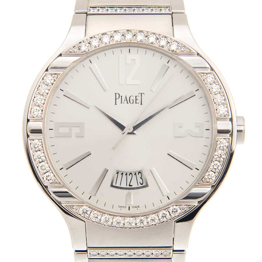 18kt white gold case and bracelet. Fixed bezel with diamond set 18kt white gold. Silver-tone dial with silver-tone hands and index hour markers. Minute markers around the outer rim. Dial Type: Analog. Date display at the 6 o'clock position. Automatic movement. Scratch resistant sapphire crystal. Solid case back. Round case shape, case size: 40 mm. Hidden clasp. Functions: date, hour, minute, second. Additional Info: original box, international warranty card, manual (complete accessories). Polo Series. Luxury watch style. Watch label: Swiss Made. Piaget Polo Automatic Diamond Silver Dial Mens Watch GOA36225.