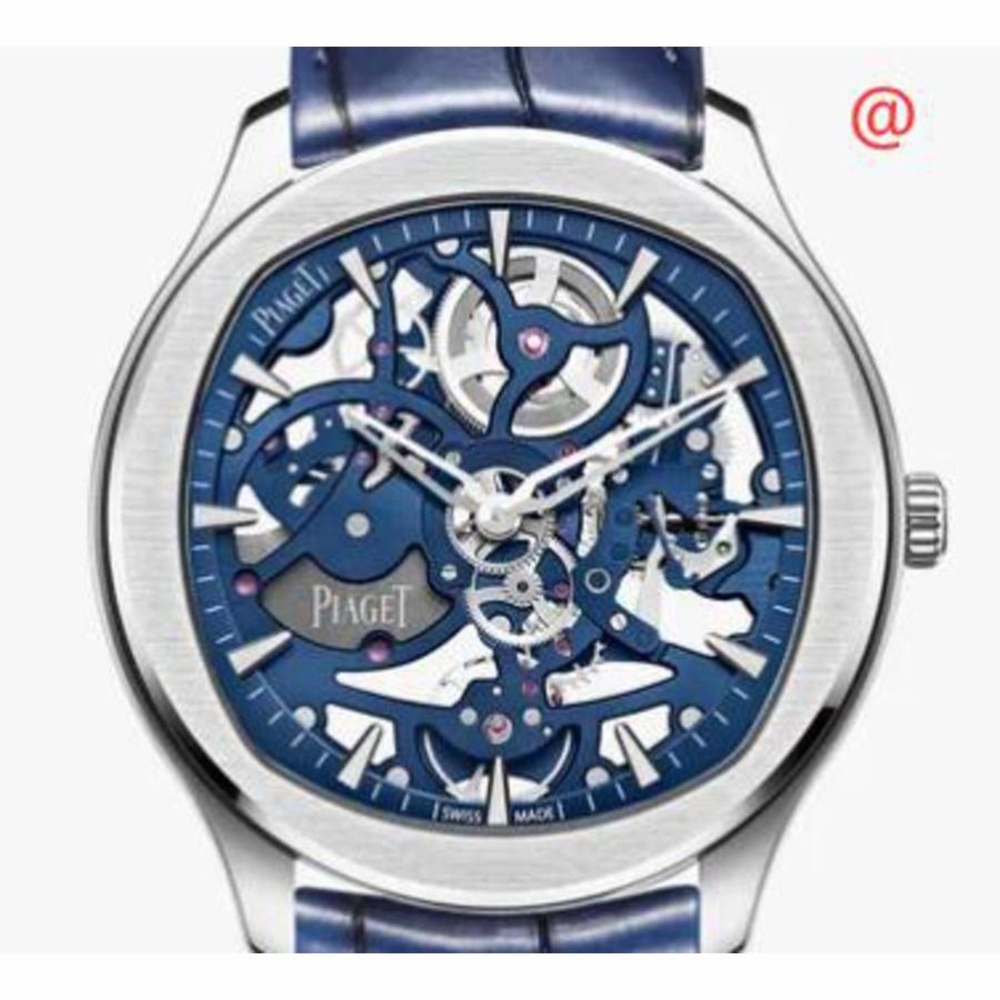Silver-tone stainless steel case with a blue leather strap. Fixed silver-tone stainless steel bezel. Transparent dial with silver-tone hands and index hour markers. Minute markers around the outer rim. Dial Type: Analog. Piaget Calibre 1200S1 automatic movement. Scratch resistant sapphire crystal. Transparent see through case back. Oval case shape, case size: 42 mm, case thickness: 6 mm. Functions: hour, minute, second. Additional Info: original box, international warranty card, manual (complete accessories). Polo Series. Luxury watch style. Watch label: Swiss Made. Piaget Polo Automatic Mens Watch G0A45004.