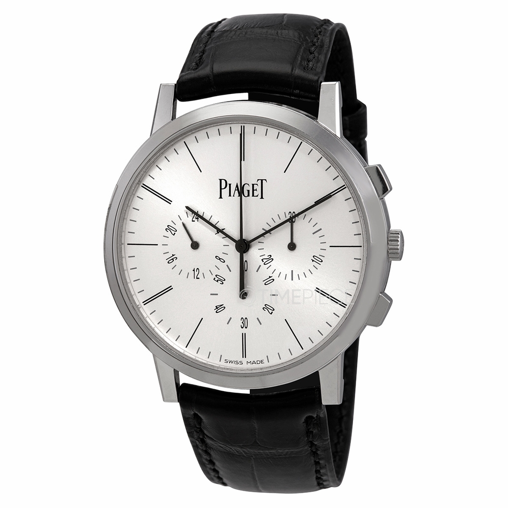 18kt white gold case with a black (alligator) leather strap. Fixed 18kt white gold bezel. Sunburst dial with black hands and index hour markers. Minute markers around the outer rim. Dial Type: Analog. Chronograph - three sub-dials displaying: 60 second, 30 minute and 24 hour. Piaget calibre 883P hand wind movement, containing 30 Jewels, composed of 240 parts, bitting at 21600 vph, and has a power reserve of approximately 50 hours. Scratch resistant sapphire crystal. Transparent case back. Round case shape. Case size: 41 mm. Case thickness: 8.24 mm. Tang clasp. Water resistant at 30 meters / 100 feet. Functions: chronograph, column wheel, flyback, GMT, second time zone, hour, minute, small second. Altiplano Series. Luxury watch style. Watch label: Swiss Made. Piaget Altiplano Chronograph Hand Wind Sunburst Dial Mens Watch G0A41035.