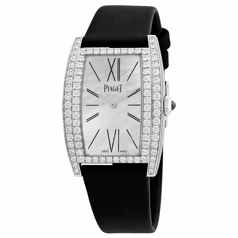 18kt white gold case with a black satin strap. Fixed 18kt white gold bezel set with diamonds. Mother of pearl dial with silver-tone hands and index hour markers. Roman numerals appear at the 6 and 12 o'clock positions. Dial Type: Analog. Piaget calibre 438P hand wind movement, containing 19 Jewels, composed of 136 parts, bitting at 21600 vph, and has a power reserve of approximately 43 hours. Scratch resistant sapphire crystal. Tonneau case shape. Case dimensions: 27 mm x 38 mm. Case thickness: 8.1 mm. Tang clasp. Water resistant at 30 meters / 100 feet. Functions: hour, minute. Limelight Series. Luxury watch style. Watch label: Swiss Made. Piaget Limelight Mother of Pearl Dial Tonneau Ladies Watch G0A41198.
