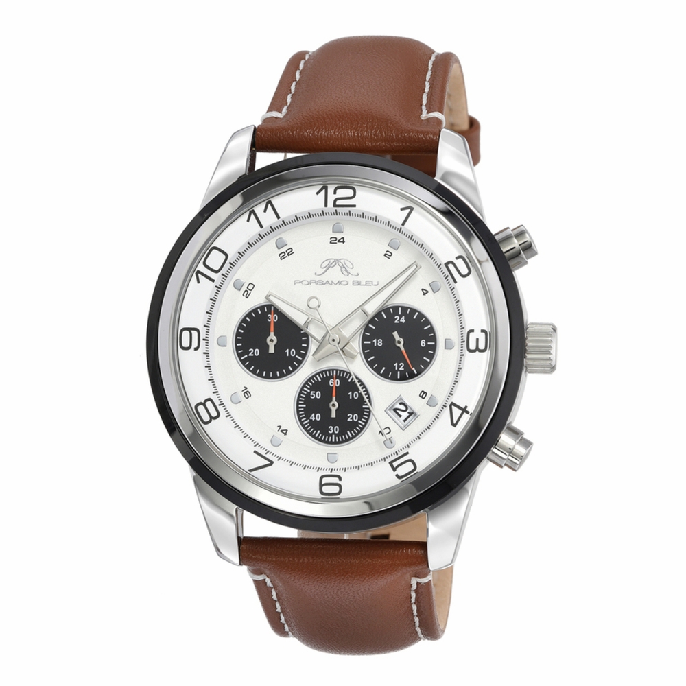 Silver-tone stainless steel case with a brown genuine leather strap. Fixed silver-tone stainless steel bezel. White dial with silver-tone hands and Arabic numeral & index hour markers. Minute markers around the outer rim. Dial Type: Analog. Date display between 4 and 5 o'clock position. Chronograph - three sub-dials displaying: 60 second, 30 minute and 24 hour. Miyota Caliber JS25 quartz movement. Scratch resistant mineral crystal. Pull / push crown. Solid case back. Round case shape, case size: 44 mm, case thickness: 12 mm. Band width: 22 mm, band length: 8 inches. Buckle clasp. Water resistant at 50 meters / 165 feet. Functions: chronograph, date, hour, minute, second. Arthur Series. Luxury watch style. Watch label: Japan Movt. Porsamo Bleu Arthur Chronograph Quartz White Dial Mens Watch 1091FARL.