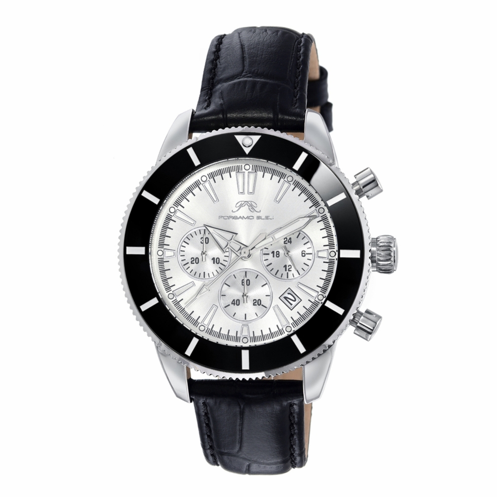 Silver-tone stainless steel case with a black leather strap. Uni-directional rotating black stainless steel bezel. Silver-tone dial with silver-tone hands and index hour markers. Minute markers around the outer rim. Dial Type: Analog. Luminescent hands and markers. Date display between 4 and 5 o'clock position. Chronograph - three sub-dials displaying: 60 second, 30 minute and 24 hour. Miyota Caliber JS25 quartz movement. Scratch resistant mineral crystal. Pull / push crown. Solid case back. Round case shape, case size: 44 mm, case thickness: 12 mm. Band width: 20 mm, band length: 8 inches. Buckle clasp. Water resistant at 50 meters / 165 feet. Functions: chronograph, date, hour, minute, second. Additional Info: chronograph. Brandon Series. Luxury watch style. Watch label: Japan Movt. Porsamo Bleu Brandon Chronograph Quartz Silver Dial Mens Watch 1012BBRL.