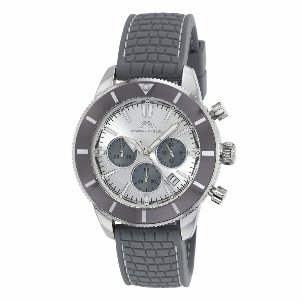 Silver-tone stainless steel case with a grey silicone strap. Uni-directional rotating grey stainless steel bezel. Silver-tone dial with silver-tone hands and index hour markers. Minute markers around the outer rim. Dial Type: Analog. Luminescent hands and markers. Date display between 4 and 5 o'clock position. Chronograph - three sub-dials displaying: 60 second, 30 minute and 24 hour. Miyota Caliber JS25 quartz movement. Scratch resistant mineral crystal. Pull / push crown. Solid case back. Round case shape, case size: 44 mm, case thickness: 12 mm. Band width: 20 mm, band length: 8 inches. Buckle clasp. Water resistant at 50 meters / 165 feet. Functions: chronograph, date, hour, minute, second. Additional Info: chronograph. Brandon Series. Luxury watch style. Watch label: Japan Movt. Porsamo Bleu Brandon Chronograph Quartz Silver Dial Mens Watch 1013CBRR.