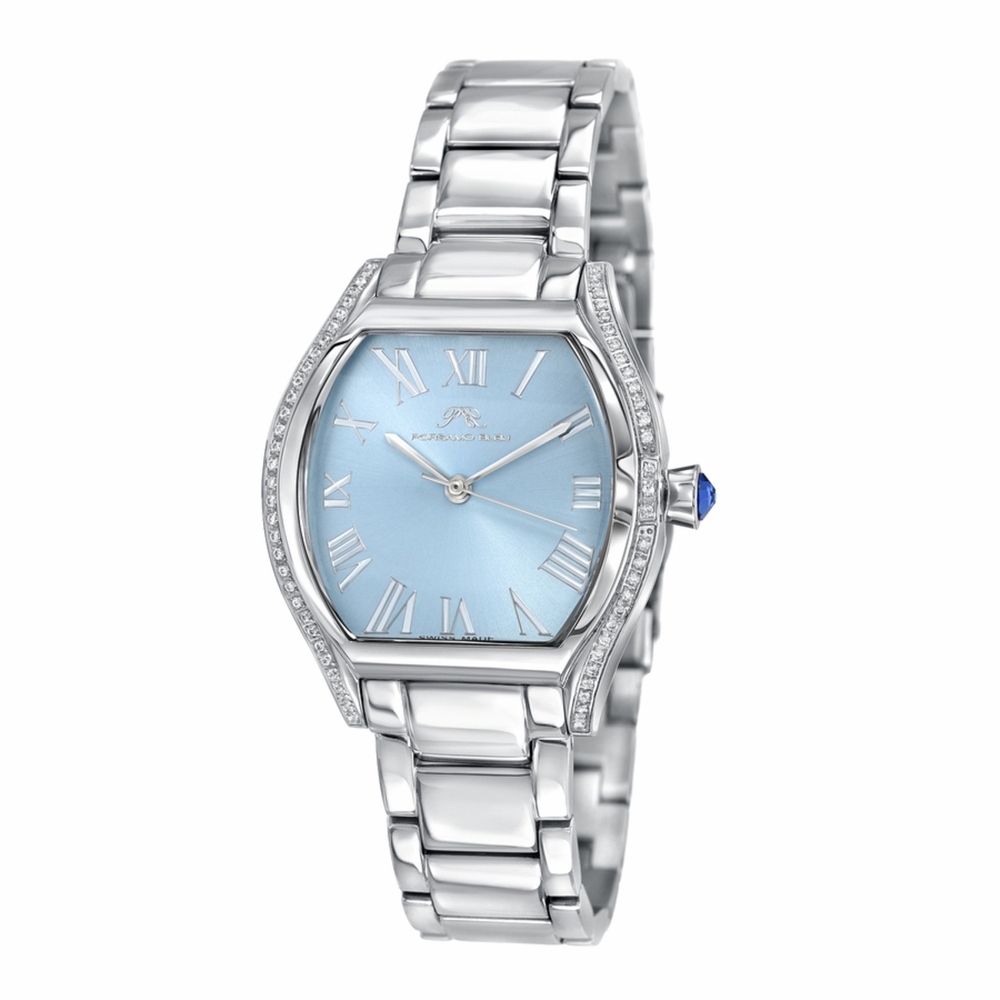 Stainless steel case with a stainless steel bracelet. Fixed stainless steel bezel set with crystals. Blue dial with silver-tone hands and index hour markers. Dial Type: Analog. Ronda caliber 763 quartz movement. Scratch resistant mineral crystal. Pull / push crown. Solid case back. Tonneau case shape. Case dimensions: 33.5 mm x 40 mm. Case thickness: 11 mm. Fold over clasp with a safety release. Water resistant at 50 meters / 165 feet. Functions: hour, minute, second. Celine Series. Luxury watch style. Watch label: Swiss Made. Porsamo Bleu Celine Quartz Blue Dial Ladies Watch 1002CCES.