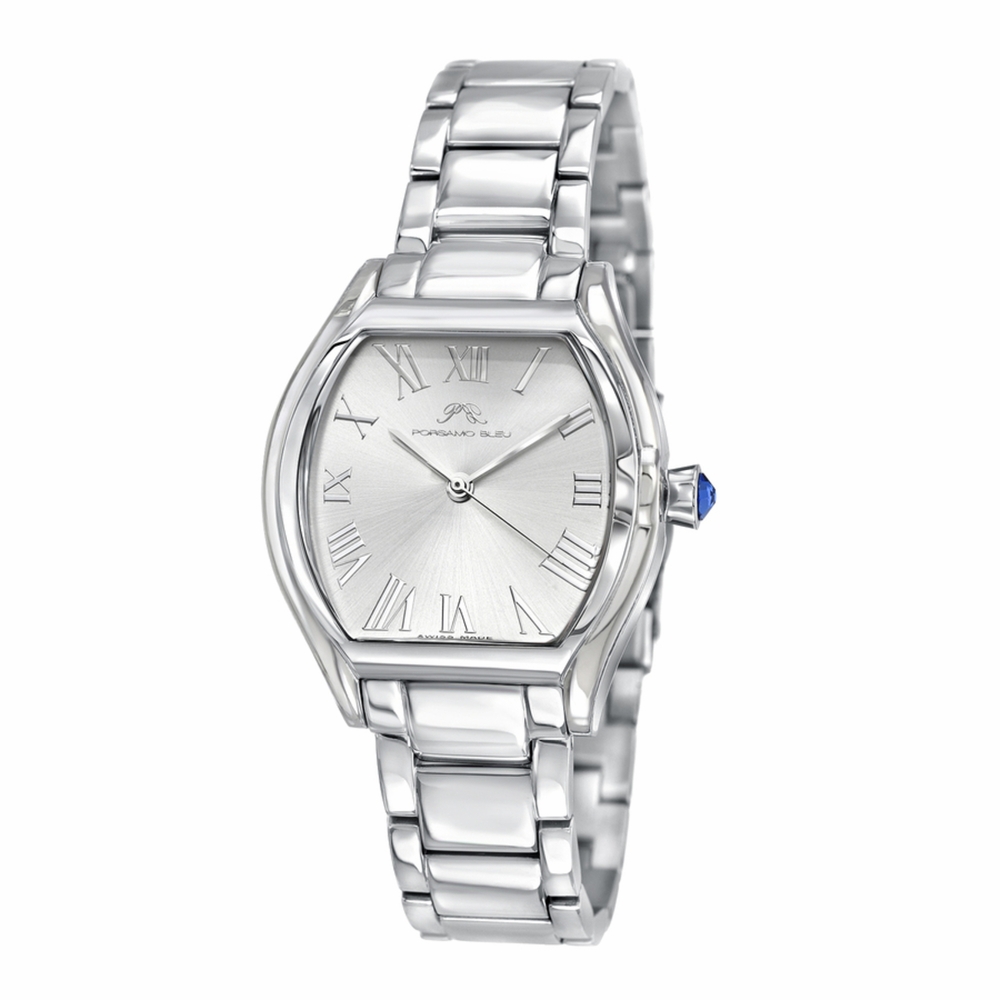 Porsamo Bleu Celine Ladies' Tonneau Shaped Watch, Stainless Steel Case And Bracelet, Silver Sunray Dial; Silver Tone Silver-tone stainless steel case and bracelet. Fixed silver-tone stainless steel bezel. Silver-tone dial with silver-tone hands and index hour markers. Dial Type: Analog. Ronda Caliber 763 quartz movement. Scratch resistant mineral crystal. Solid case back. Tonneau case shape, case size: 37 mm. Deployment with push button release clasp. Water resistant at 50 meters / 165 feet. Functions: hour, minute, second. Celine Series. Luxury watch style. Watch label: Swiss Made. Porsamo Bleu Celine Quartz Silver Dial Ladies Watch 1001ACES.