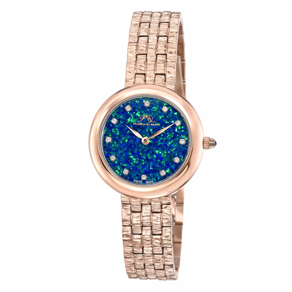 Rose gold-tone stainless steel case and bracelet. Fixed rose gold-tone stainless steel bezel. Blue dial with rose gold-tone hands and diamond hour markers. Dial Type: Analog. Ronda Caliber 762 quartz movement. Scratch resistant mineral crystal. Solid case back. Round case shape, case size: 32 mm. Deployment with push button release clasp. Water resistant at 30 meters / 100 feet. Functions: hour, minute. Charlize Series. Luxury watch style. Watch label: Swiss Movt. Porsamo Bleu Charlize Quartz Diamond Blue Dial Ladies Watch 1111CCHS.