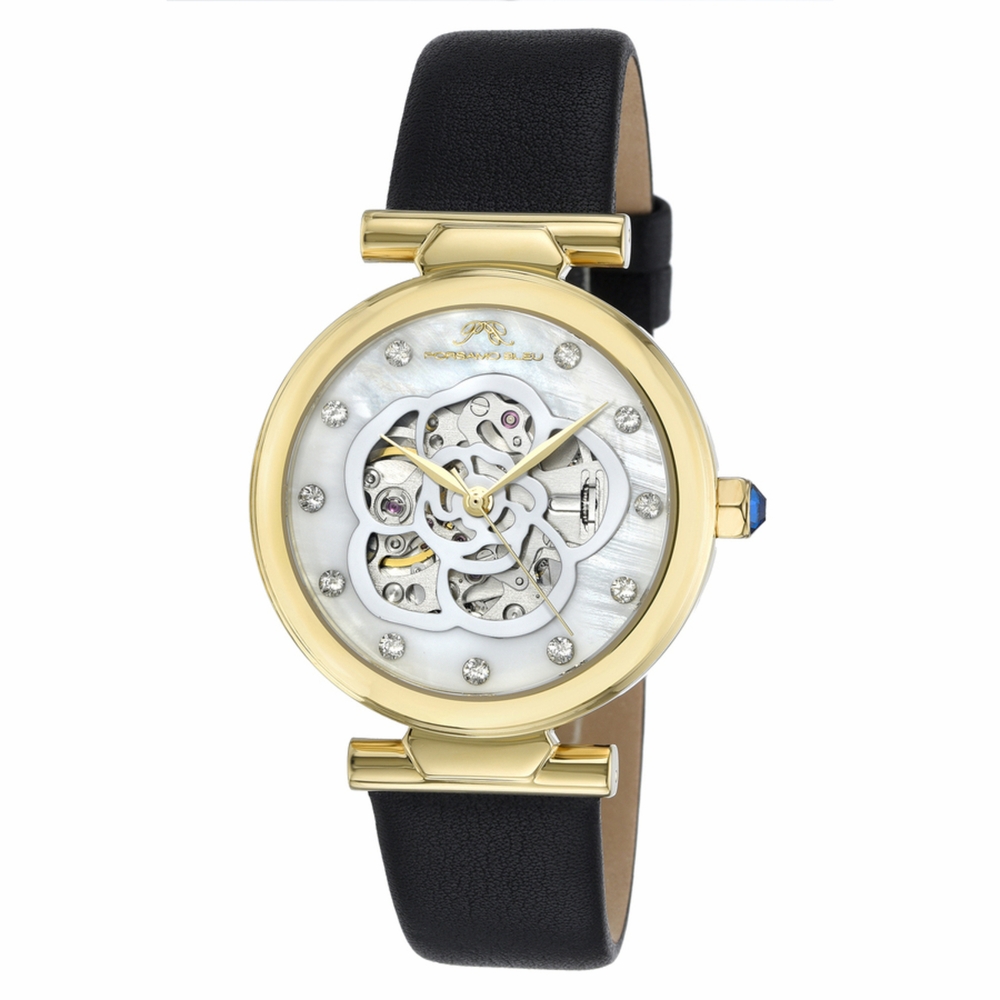 Porsamo Bleu Laura Ladies' Automatic Watch With Stainless Steel Case And Genuine Leather Black Strap; With Topaz Hour Markers; Mother Of Pearl Skeleton White Dial; Gold Tone & Black. Yellow gold-tone stainless steel case with a black genuine leather strap. Fixed yellow gold-tone stainless steel bezel. White dial with yellow gold-tone hands and index hour markers. Dial Type: Analog. TMI Caliber NH70 Automatic movement, containing 24 Jewels, bitting at 21600 vph, and has a power reserve of approximately 41 hours. Scratch resistant mineral crystal. Pull / push crown. Solid case back. Round case shape, case size: 36 mm, case thickness: 12 mm. Band width: 18 mm. Buckle clasp. Water resistant at 50 meters / 165 feet. Functions: hour, minute, second. Additional Info: stunning mother of pearl dial with topaz gemstone hour markers. Laura Series. Luxury watch style. Watch label: Japan Movt. Porsamo Bleu Laura Automatic White Dial Ladies Watch 1211BLAL.