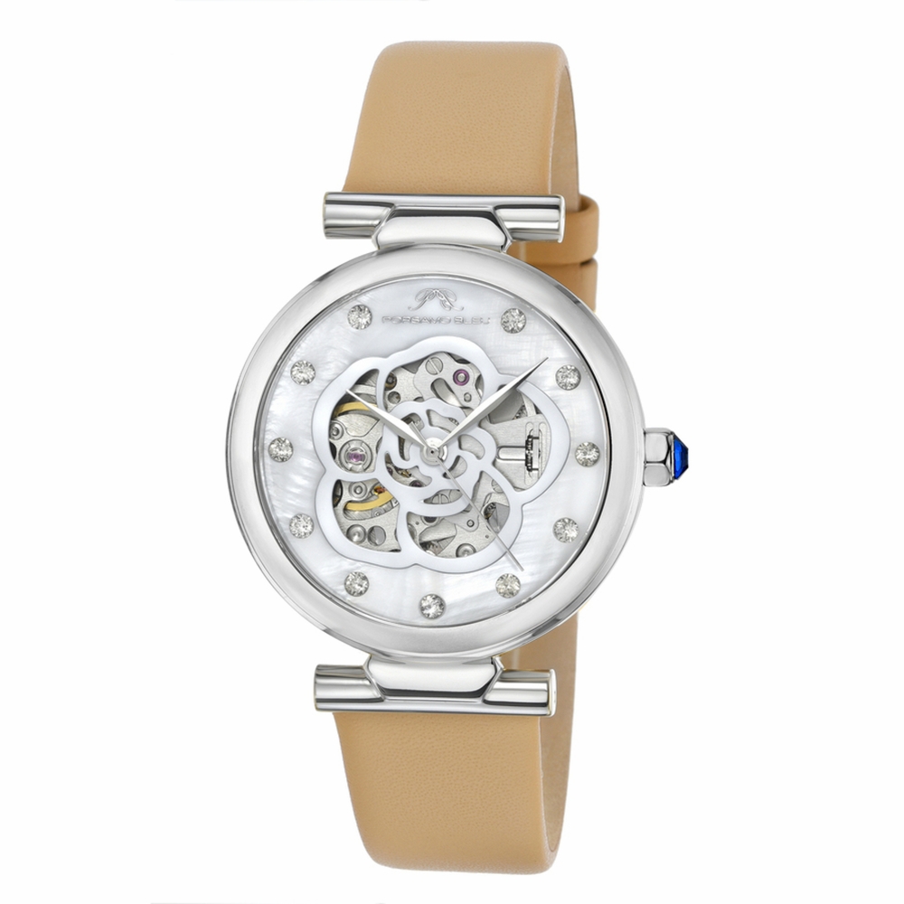 Porsamo Bleu Laura Ladies' Automatic Watch With Stainless Steel Case And Genuine Leather Black Strap; With Topaz Hour Markers; Mother Of Pearl Skeleton White Dial; Silver Tone & Beige. Silver-tone stainless steel case with a beige genuine leather strap. Fixed silver-tone stainless steel bezel. White dial with silver-tone hands and index hour markers. Dial Type: Analog. TMI Caliber NH70 Automatic movement, containing 24 Jewels, bitting at 21600 vph, and has a power reserve of approximately 41 hours. Scratch resistant mineral crystal. Pull / push crown. Solid case back. Round case shape, case size: 36 mm, case thickness: 12 mm. Band width: 18 mm. Buckle clasp. Water resistant at 50 meters / 165 feet. Functions: hour, minute, second. Additional Info: stunning mother of pearl dial with topaz gemstone hour markers. Laura Series. Luxury watch style. Watch label: Japan Movt. Porsamo Bleu Laura Automatic White Dial Ladies Watch 1212ALAL.