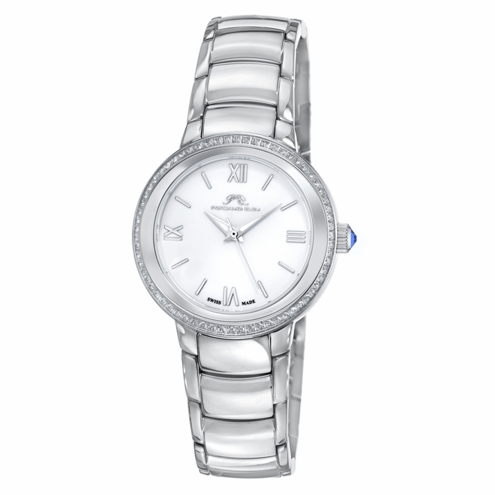 Porsamo Bleu Luna Ladies' Watch With Topaz Gemstone Inlaid Stainless Steel Bezel; Enamel Dial; Silver Tone Silver-tone stainless steel case and bracelet. Fixed silver-tone stainless steel bezel. Pink dial with silver-tone hands and index hour markers. Dial Type: Analog. Ronda Caliber 763 quartz movement. Scratch resistant mineral crystal. Solid case back. Round case shape, case size: 34 mm. Fold over clasp with a safety release. Water resistant at 50 meters / 165 feet. Functions: hour, minute, second. Luna Series. Luxury watch style. Watch label: Swiss Movt. Porsamo Bleu Luna Quartz Pink Dial Ladies Watch 1181ELUS.