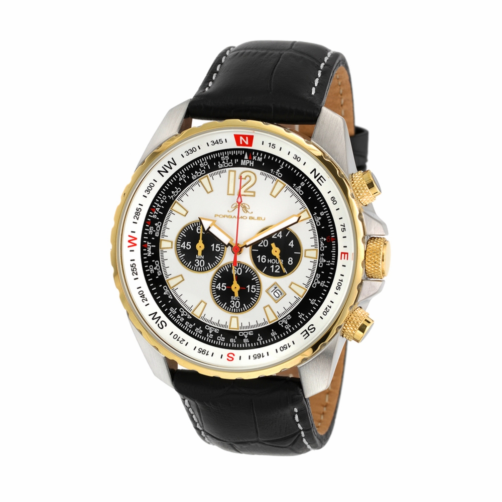 Porsamo Bleu Martin Men's Chronograph Tachymeter Watch with stainless steel case and genuine leather strap, date window between 4 and 5 o'clock; Silver tone, gold tone & black Silver-tone stainless steel case with a black stainless steel bracelet. Fixed yellow gold-tone stainless steel bezel. White dial with yellow gold-tone hands and index hour markers. Minute markers around the outer rim. Dial Type: Analog. Luminescent hands and markers. Date display between 4 and 5 o'clock position. Chronograph - three sub-dials displaying: 60 second, 60 minute and 24 hour. Miyota Caliber OS20 quartz movement. Scratch resistant mineral crystal. Solid case back. Round case shape, case size: 46 mm. Buckle clasp. Water resistant at 100 meters / 330 feet. Functions: chronograph, date, hour, minute, second. Martin Chronograph Series. Luxury watch style. Watch label: Japan Movt. Porsamo Bleu Martin Chronograph Quartz White Dial Mens Watch 352BMAL.