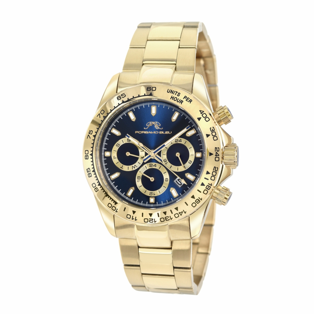 Yellow gold-tone stainless steel case and bracelet. Fixed yellow gold-tone stainless steel bezel. Blue dial with yellow gold-tone hands and index hour markers. Minute markers around the outer rim. Dial Type: Analog. Luminescent hands and markers. Date display between 4 and 5 o'clock position. Miyota JP25-00C Quartz quartz movement. Scratch resistant mineral crystal. Solid case back. Round case shape, case size: 36 mm. Deployment with push button release clasp. Water resistant at 100 meters / 330 feet. Functions: chronograph, day, date, hour, minute, second. Preston Series. Luxury watch style. Porsamo Bleu Preston Chronograph Quartz Blue Dial Mens Watch 1033BPRS.
