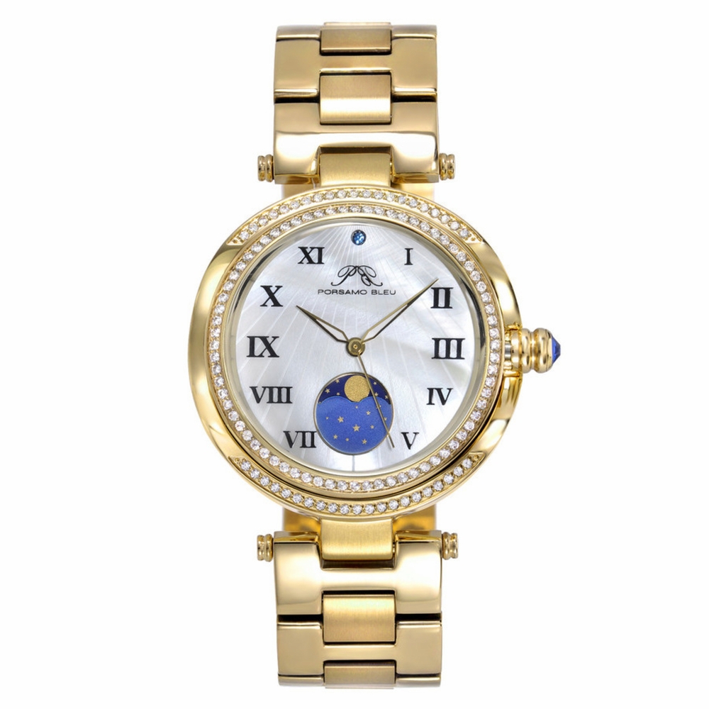 Porsamo Bleu South Sea Crystal Moon Ladies' Watch With Dazzling Crystals Inlaid In Bezel, Stainless Steel Case And Bracelet, Carved Mother Of Pearl Dial With Moon Phase Sub-Dial And Bleu SwarovskiŽ Crystal At 12 O'Clock & Push In Crown With Bleu SwarovskiŽ Crystal; Champagne Yellow gold-tone stainless steel case and bracelet. Fixed yellow gold-tone stainless steel bezel. Mother of pearl dial with yellow gold-tone hands and Roman numeral hour markers. Dial Type: Analog. Luminescent hands. One subdial displaying: moonphase. Miyota Caliber 6P24 quartz movement. Scratch resistant mineral crystal. Solid case back. Round case shape, case size: 40 mm. Deployment with push button release clasp. Water resistant at 50 meters / 165 feet. Functions: moon phase, hour, minute, second. South Sea Crystal Moon Series. Luxury watch style. Watch label: Japan Movt. Porsamo Bleu South Sea Crystal Moon Quartz Ladies Watch 108BSSM.