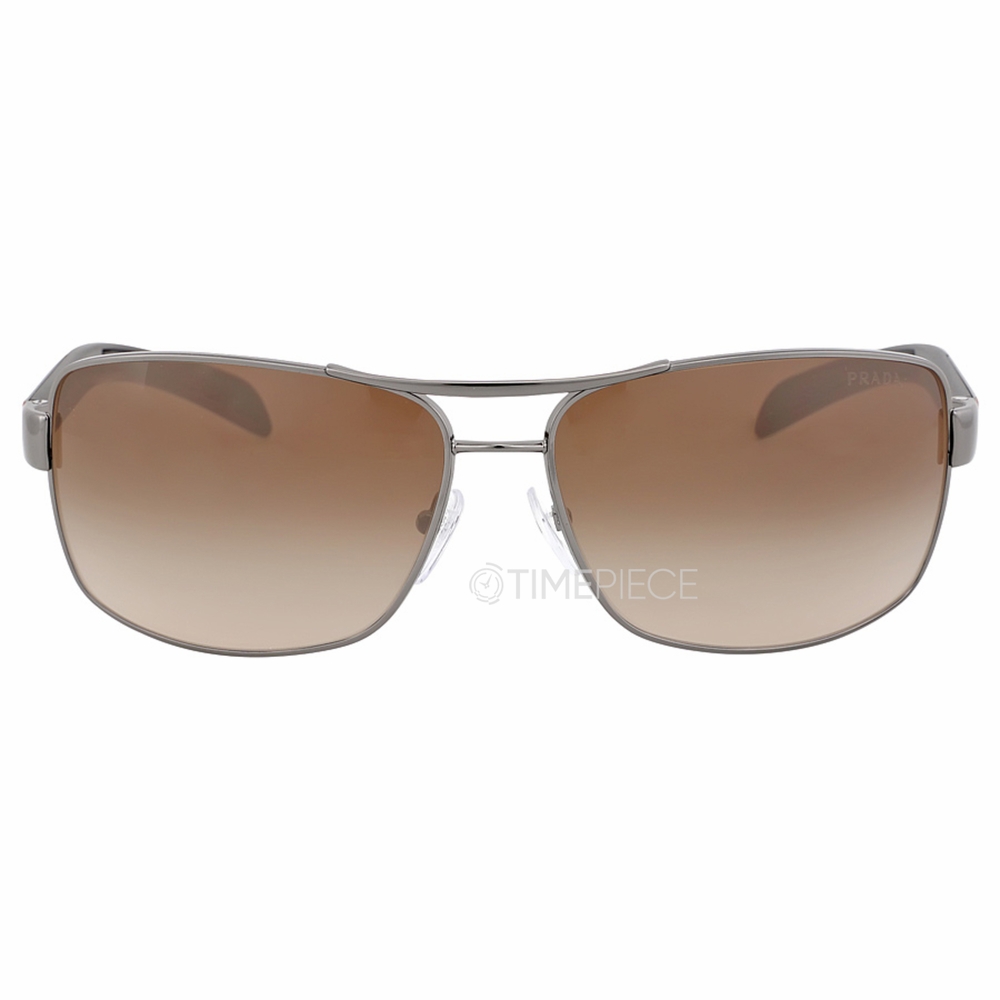 - A pair of Prada sunglasses crafted in a rectangle gunmetal frame with double bridge and brown gradient lenses.