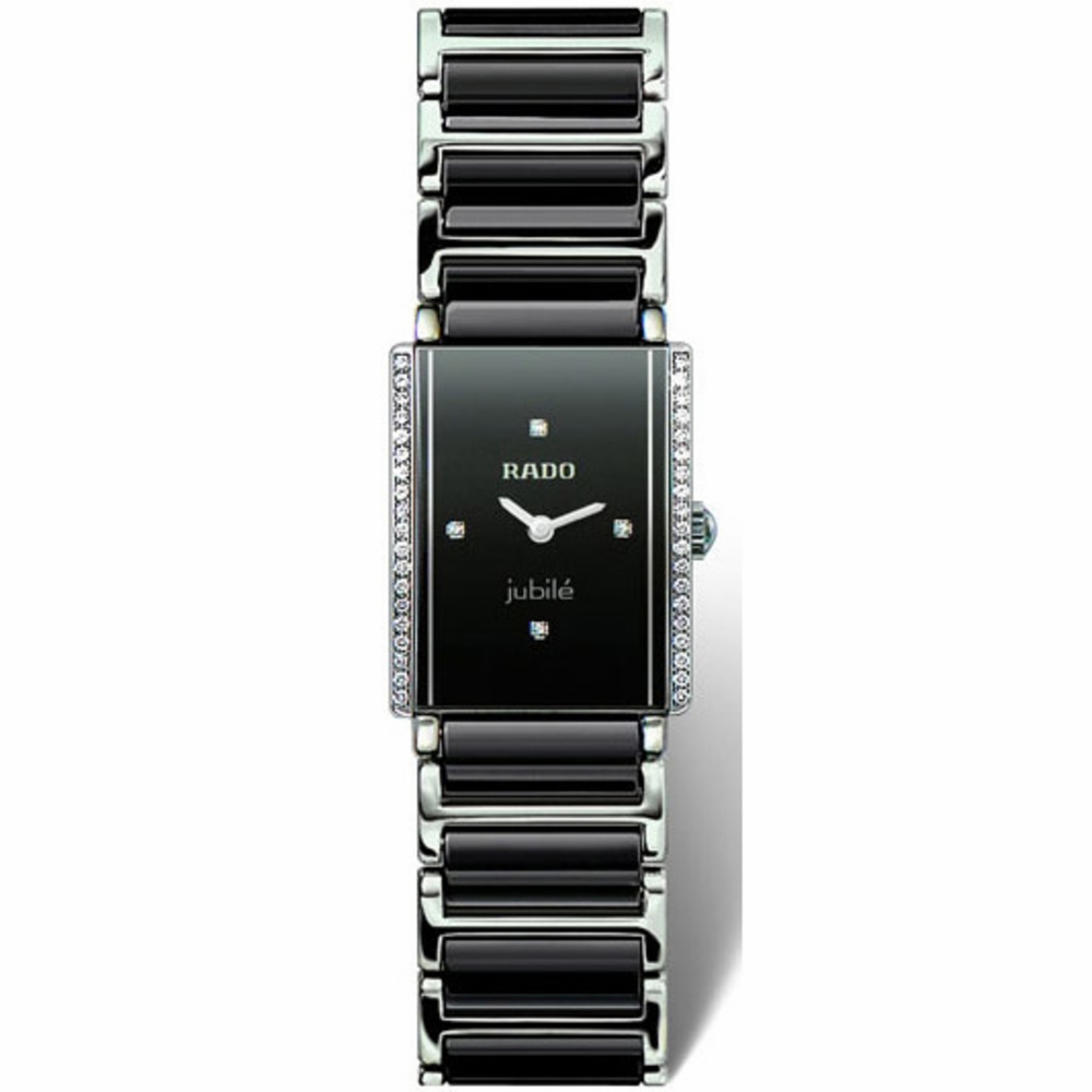 Black ceramic case with a two-tone (silver-tone and black) ceramic and stainless steel bracelet. 38 diamonds diamond set bezel. Black dial with silver-tone hands and diamond hour markers. Dial Type: Analog. Rado Calibre 153 quartz movement. Scratch resistant sapphire crystal. Solid case back. Case size: 22 mm x 18 mm. Rectangle case shape. Hidden push button deployment clasp. Water resistant at 30 meters / 100 feet. Functions: hour, minute. Additional Info: case set with 38 diamonds ws 8\8. scratch resistant ceramic watch. Dress watch style. Watch label: Swiss Made. Item Variations: R20430712, Rado-R20430712, 20430712. Rado Integral Ladies Watch R20430712.