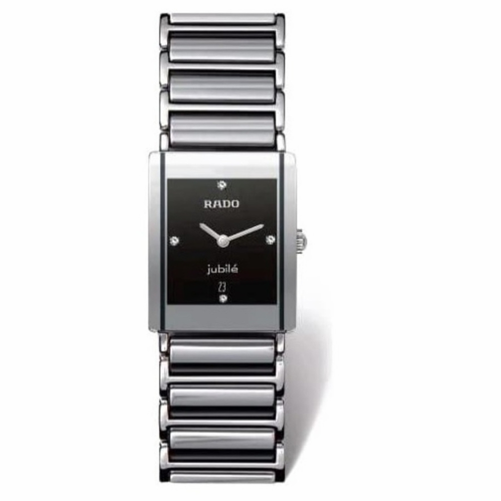 Black Dial. 4 Diamond Hour Markers. Date at 6 O'Clock. Case size approx. 24X28mm. Battery Operated Quartz Movement. Scratch Resistant Sapphire Crystal. Silver Tone Case and Bracelet with Stainless Steel Trim. Scratch Resistant Ceramic Case & Bracelet. 30 Meters \ 100 Water Resistant Rado Integral Midsize Watch. Item # R20486722